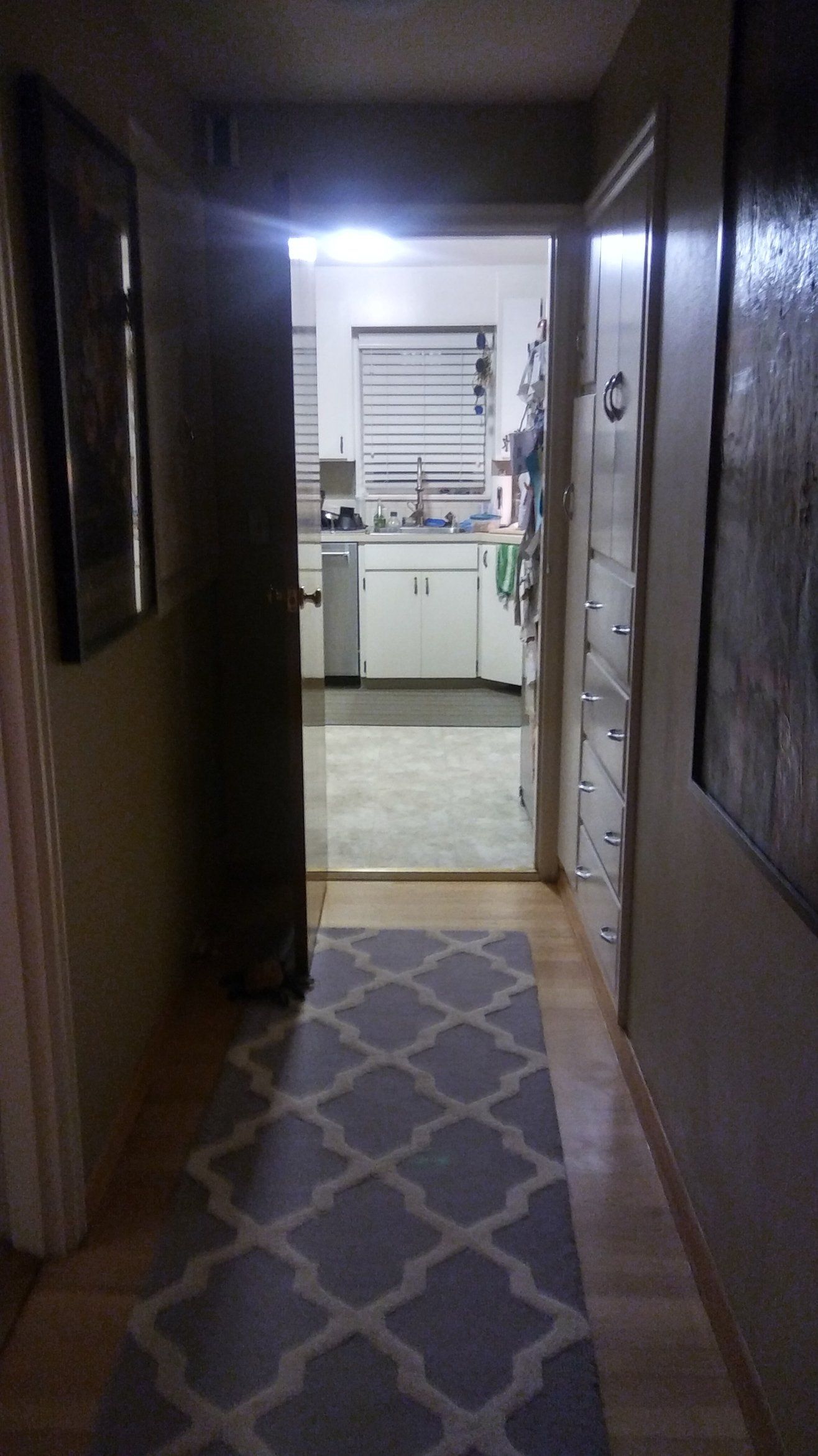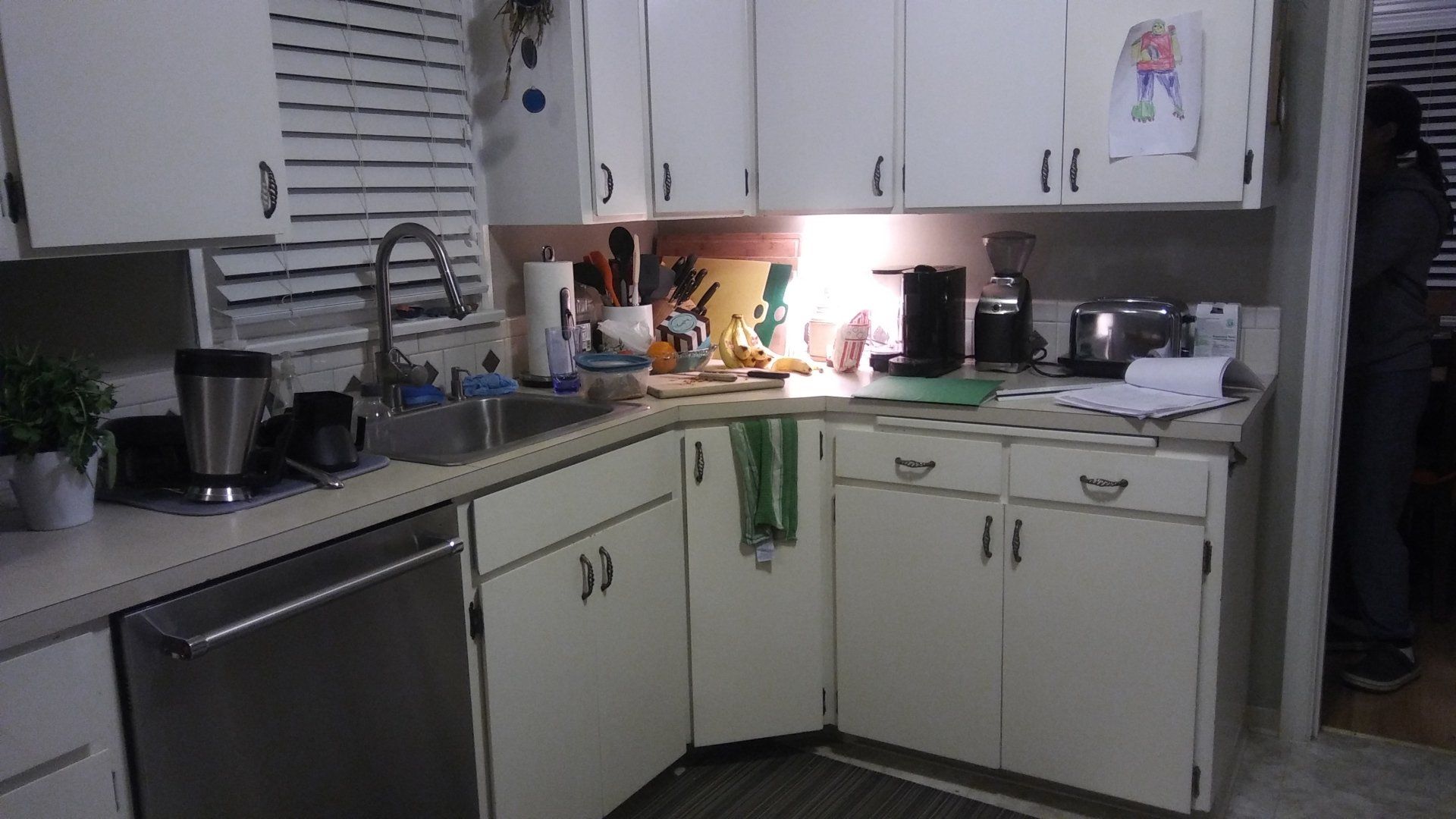 - New can lights in kitchen ceiling and pendant lights above peninsula island counter.