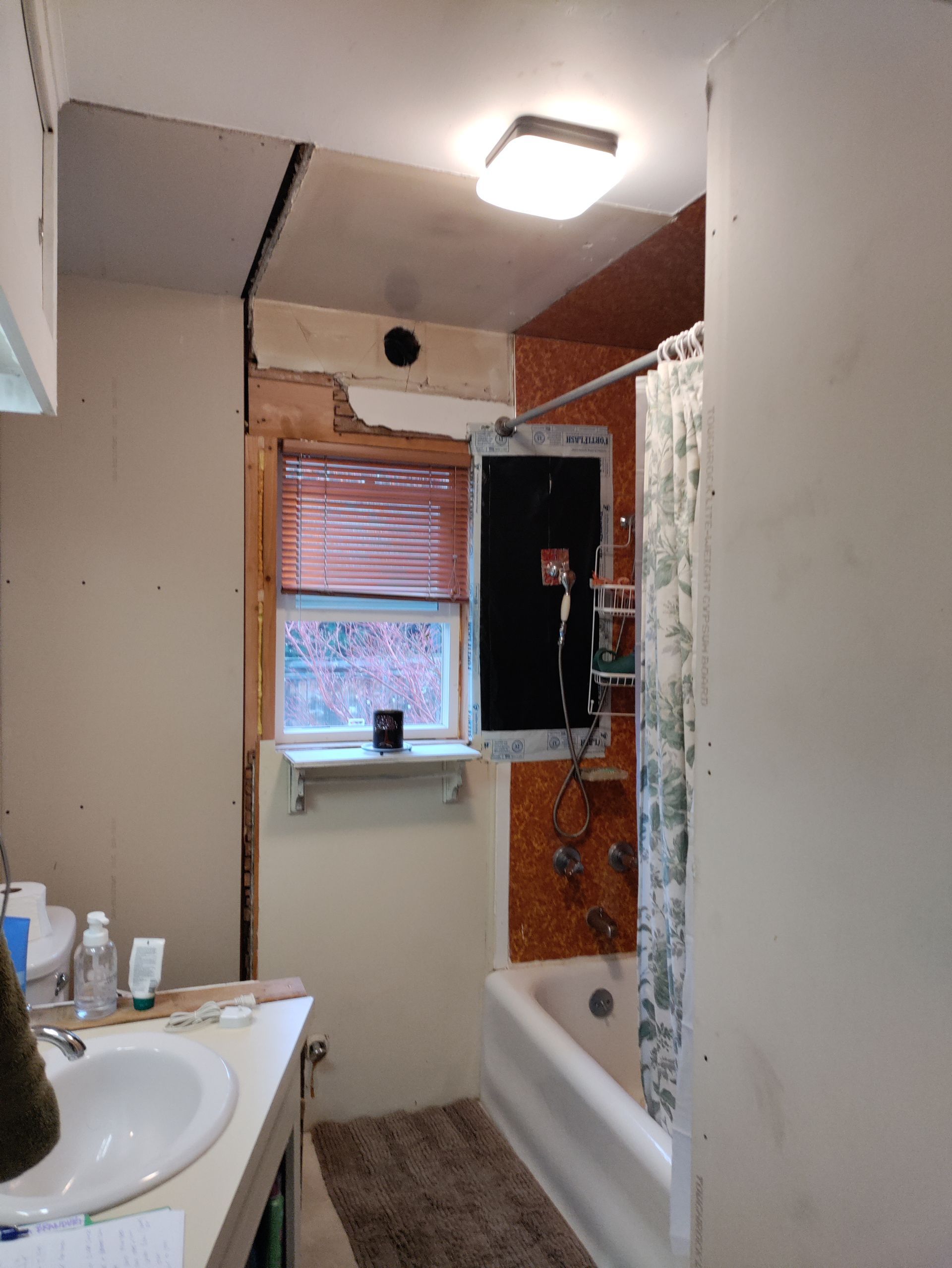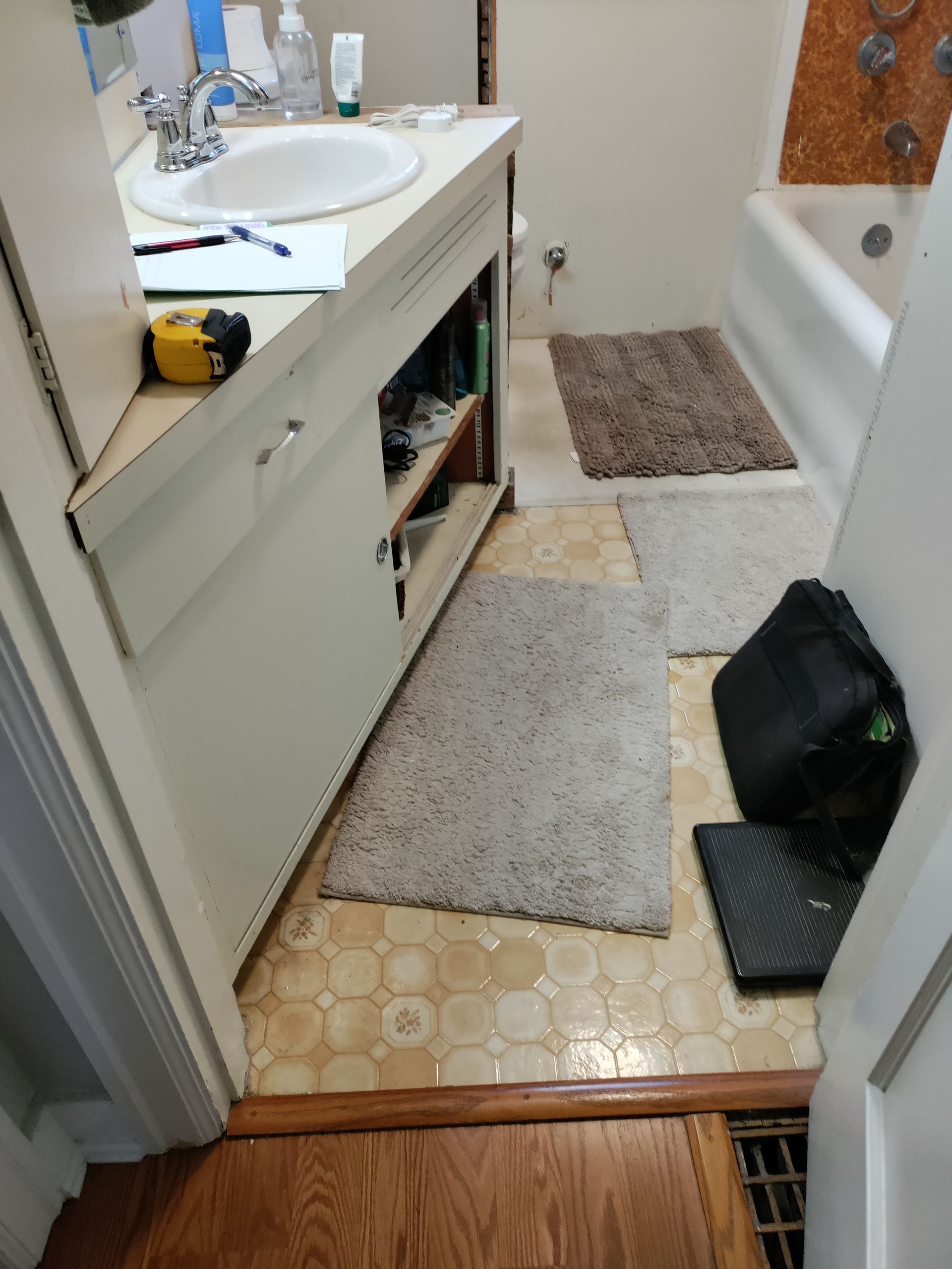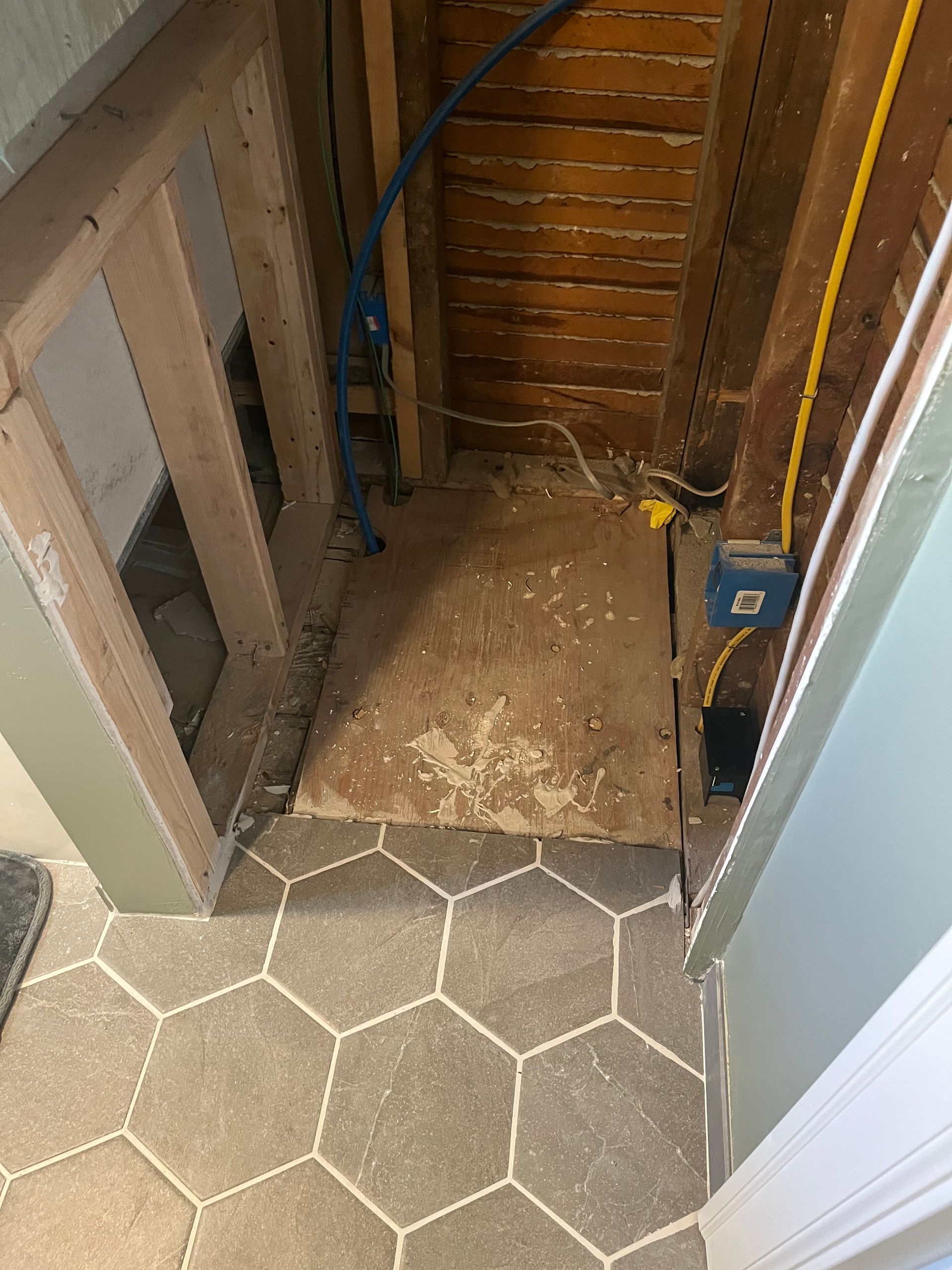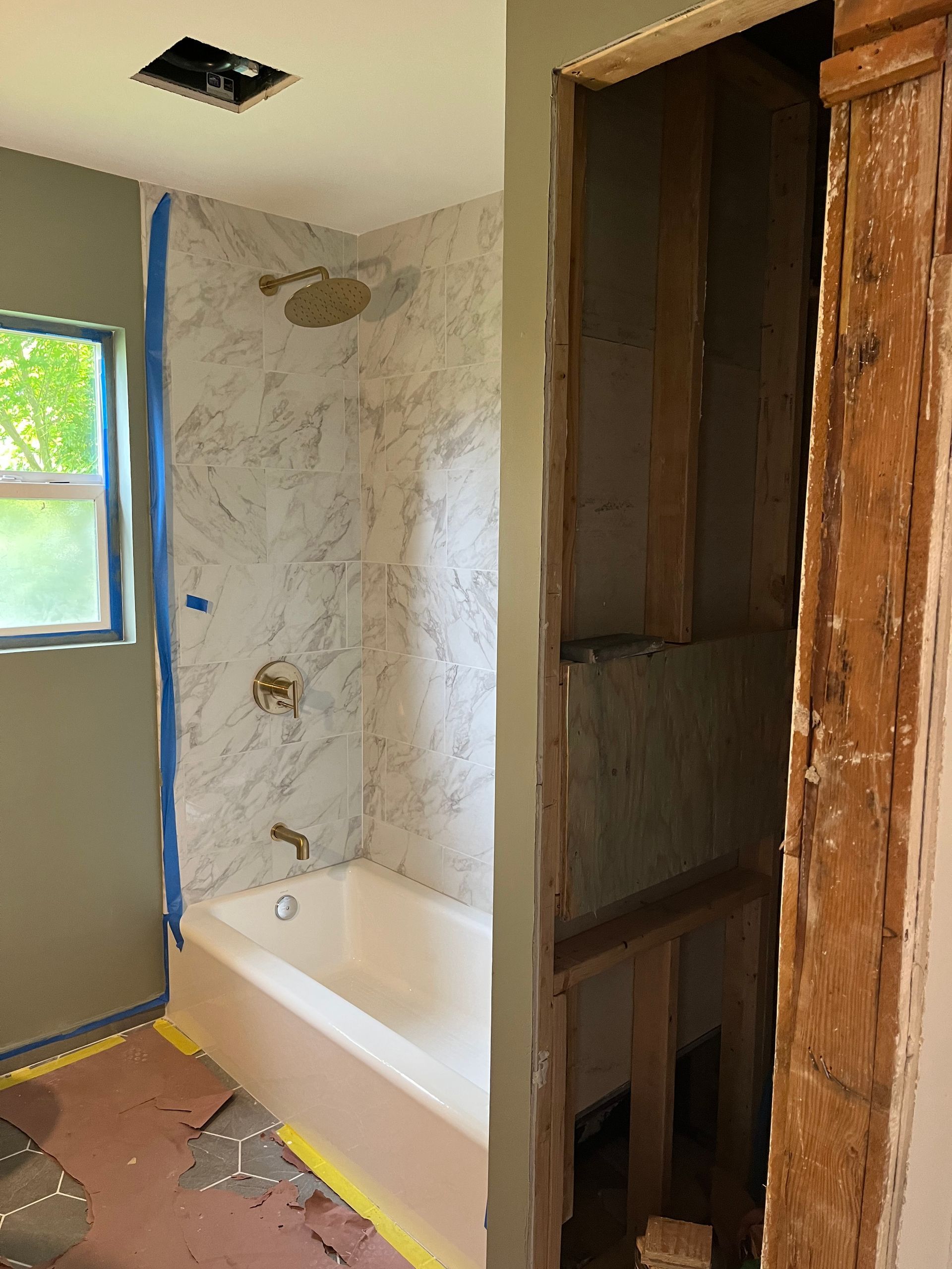- We removed existing tub, vanity, and toilet, and gutted the room down to studs and sub-floor.