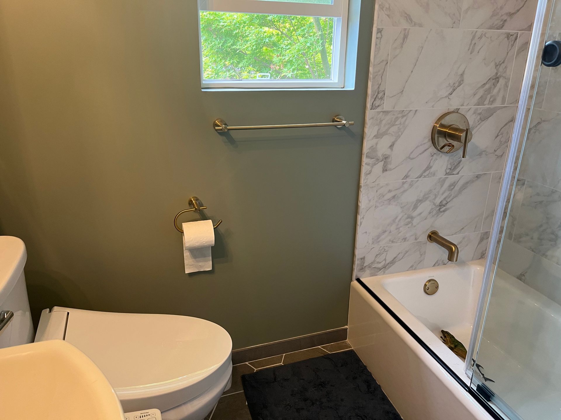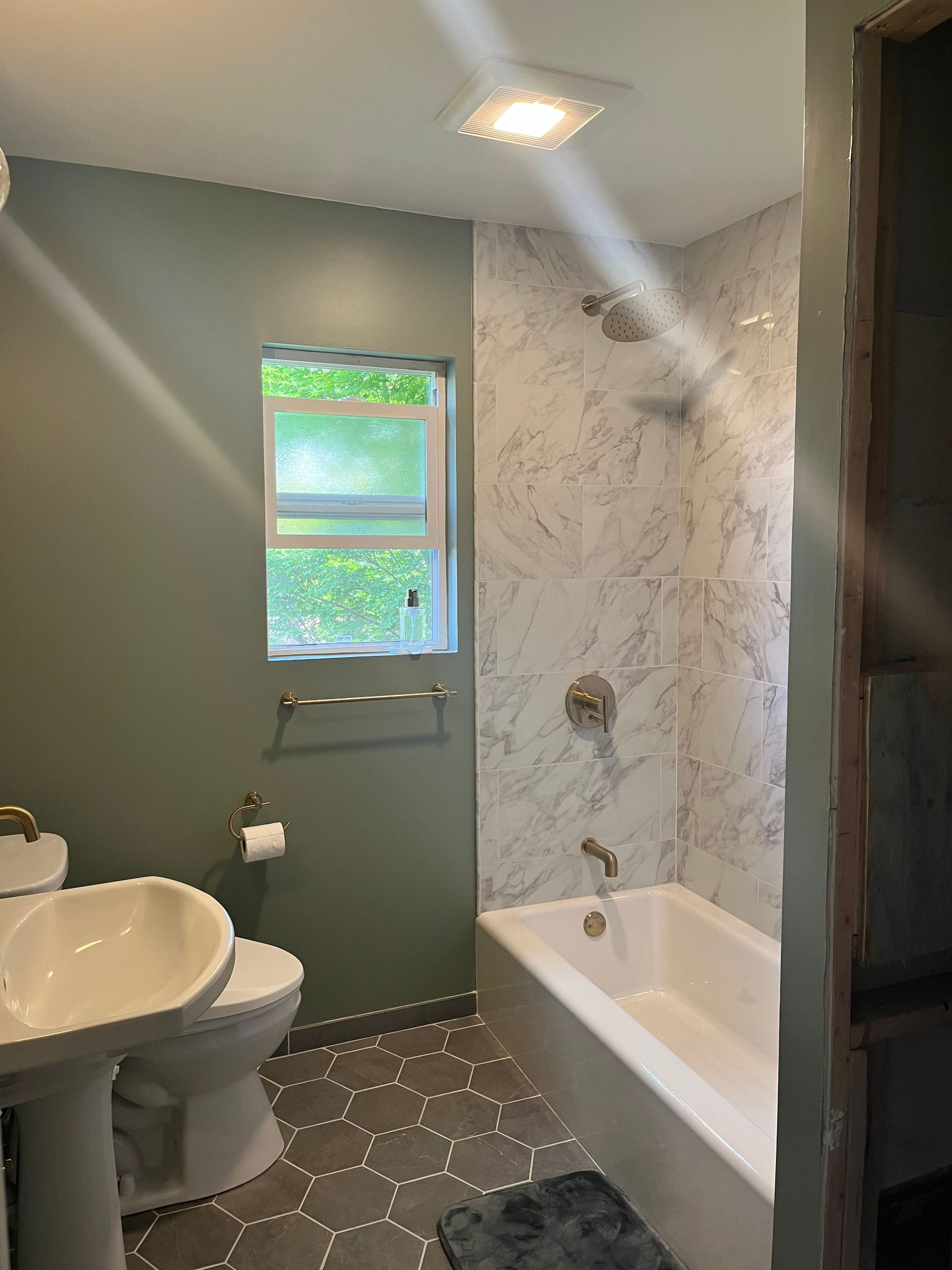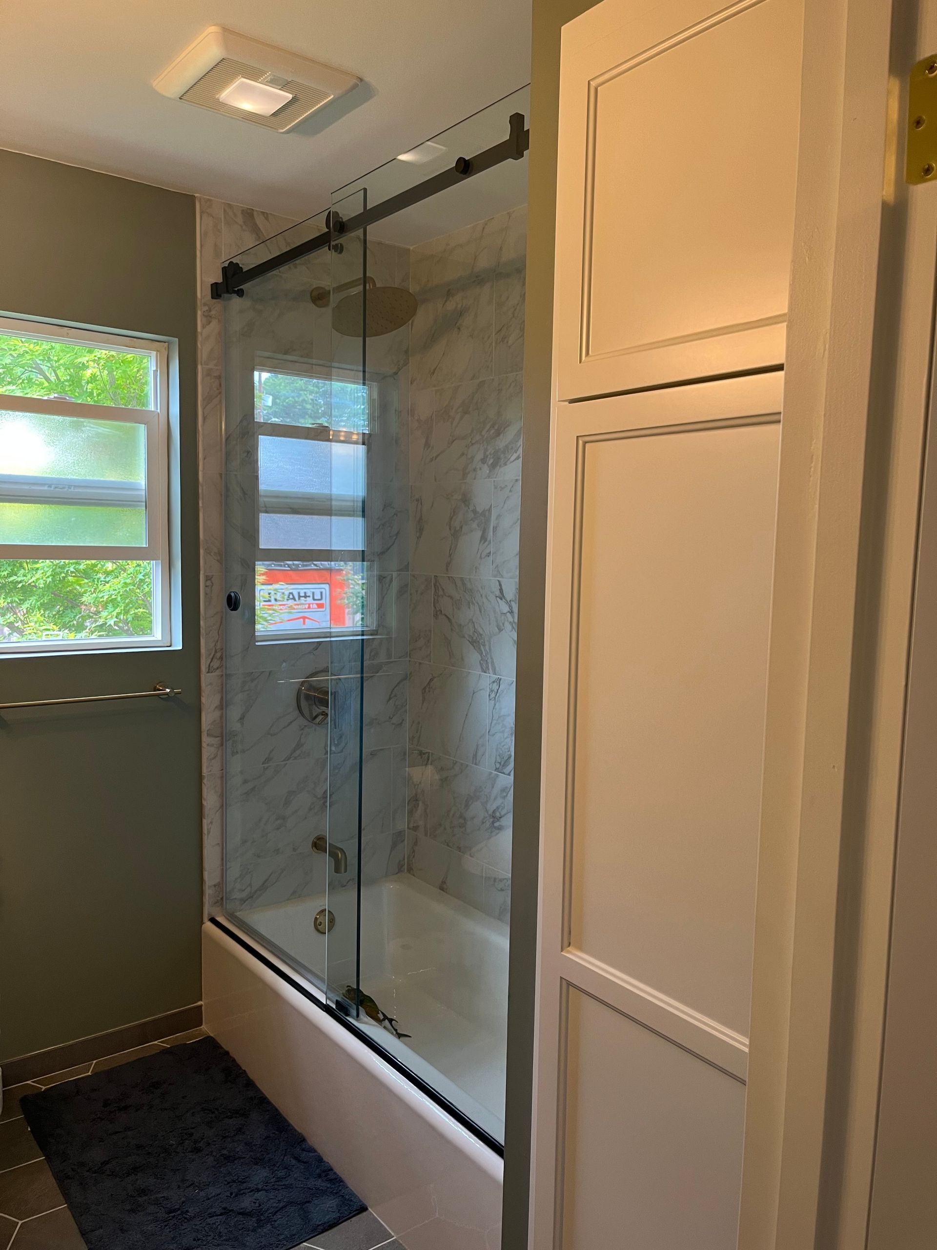 - Installed custom made “Barn door style” sliding shower door over the tub.