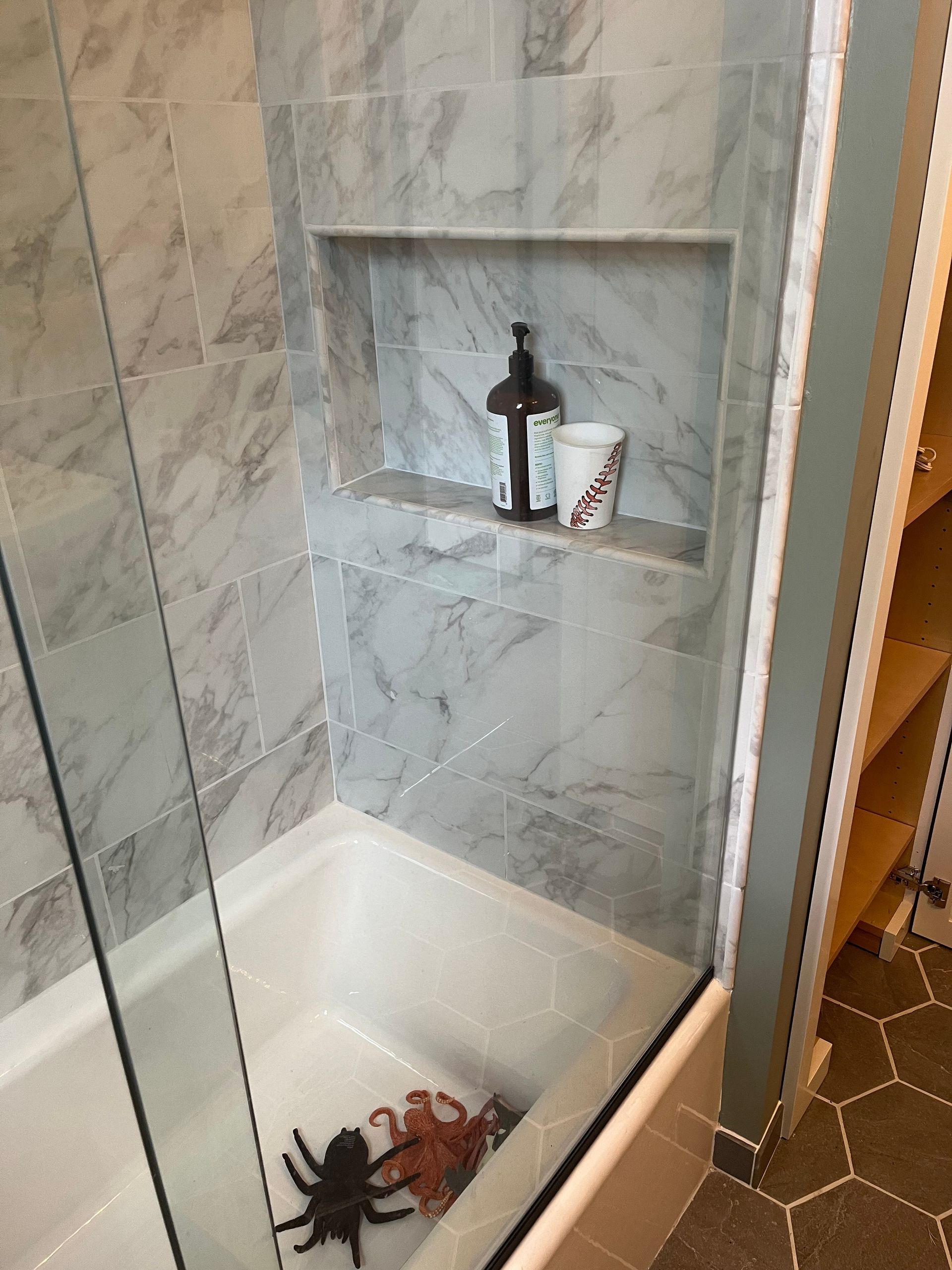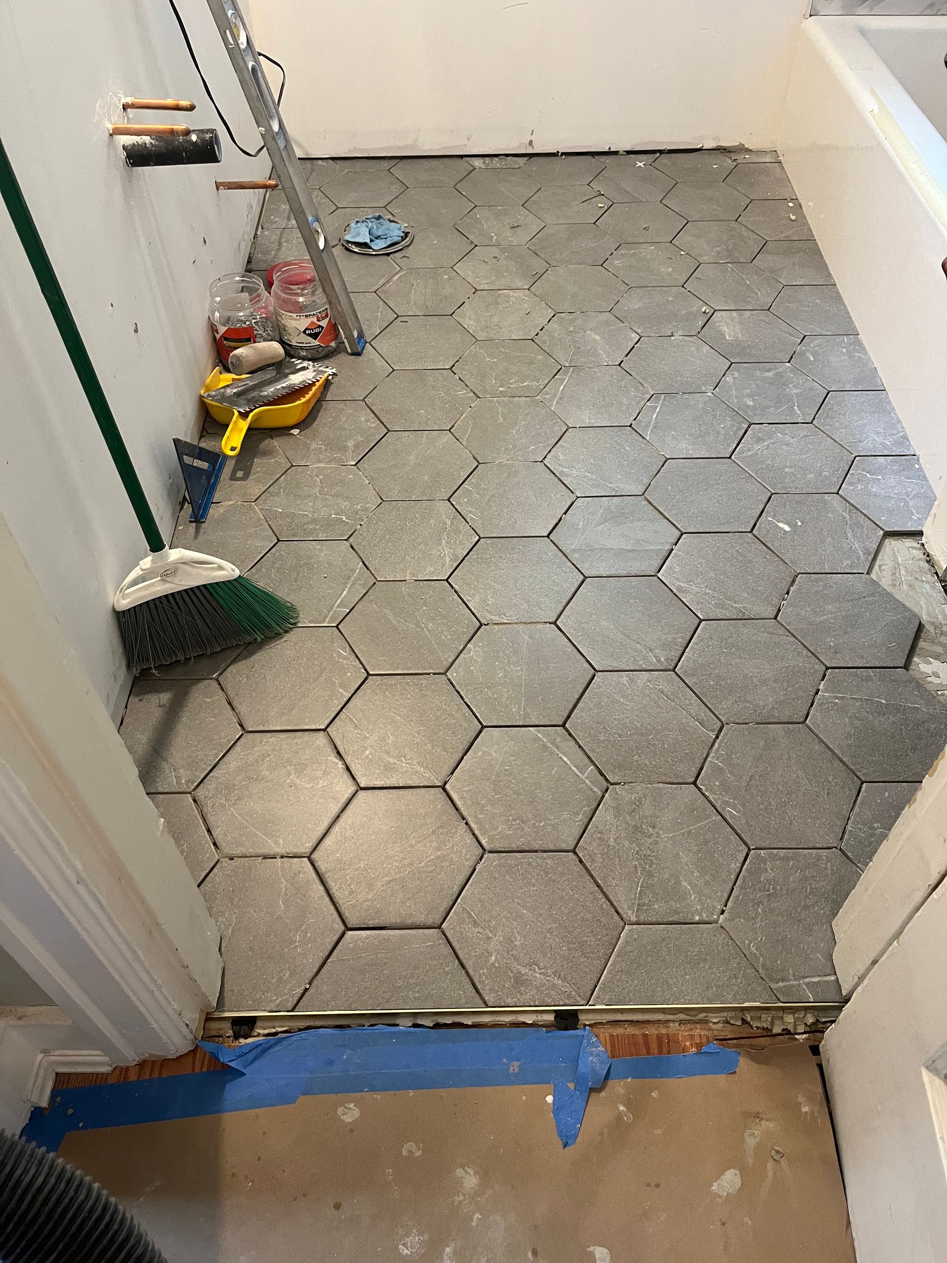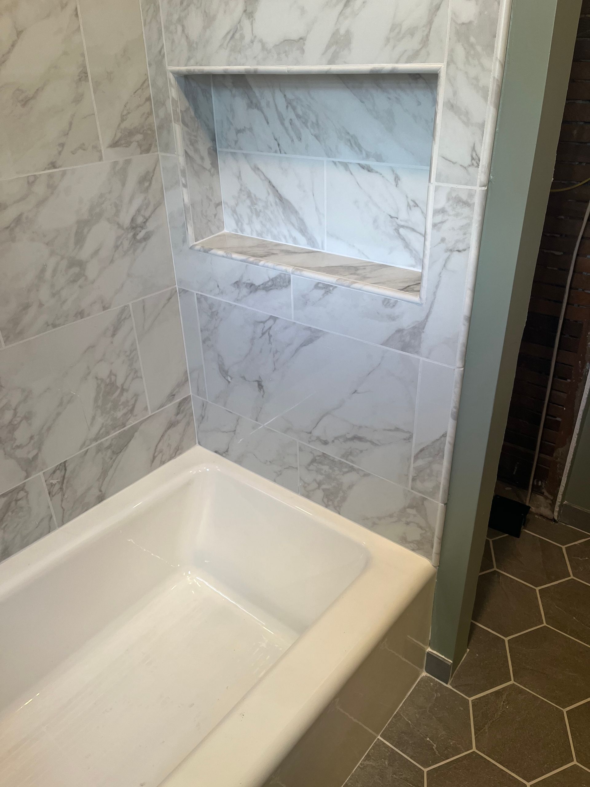 - We installed tiles around tub, with built-in tiled niche & new larger size hex tiles on the bath floor and tiled base trim.