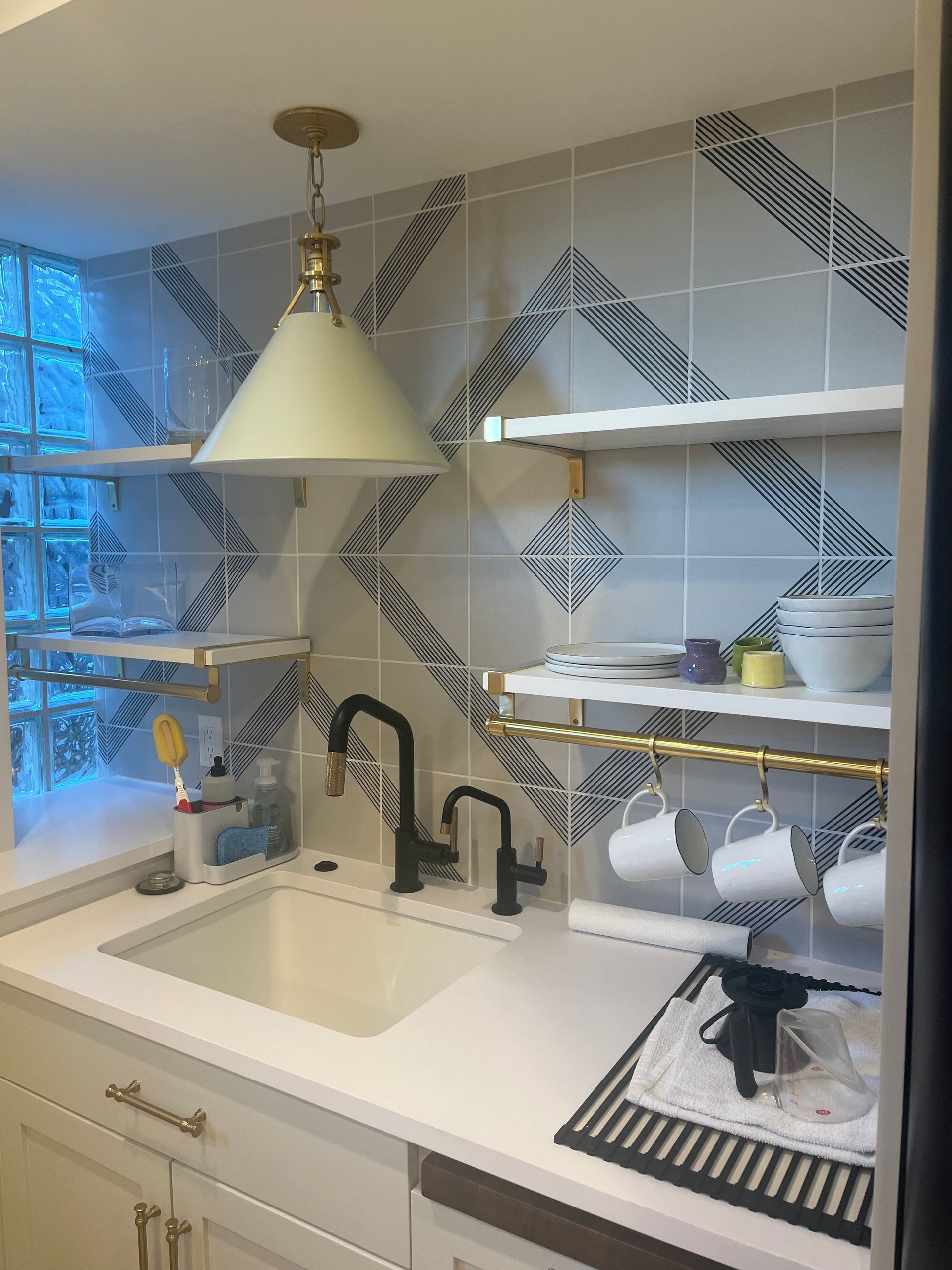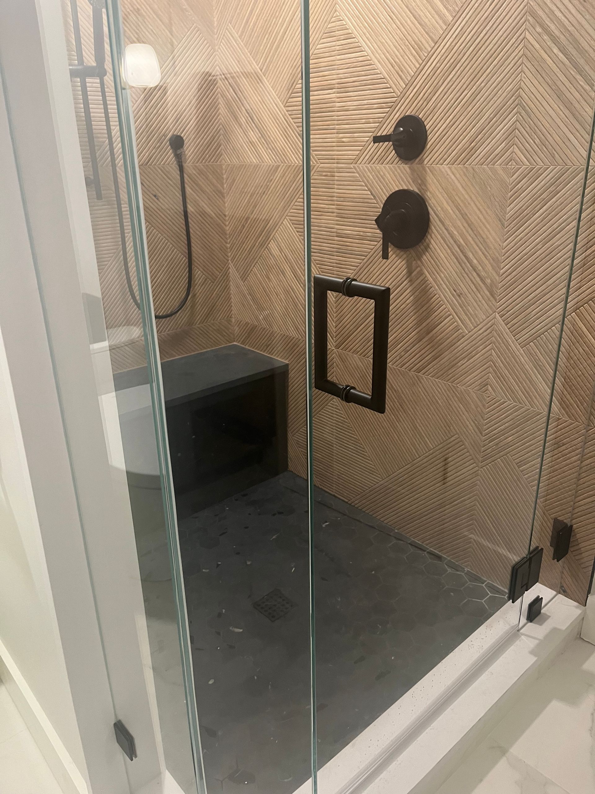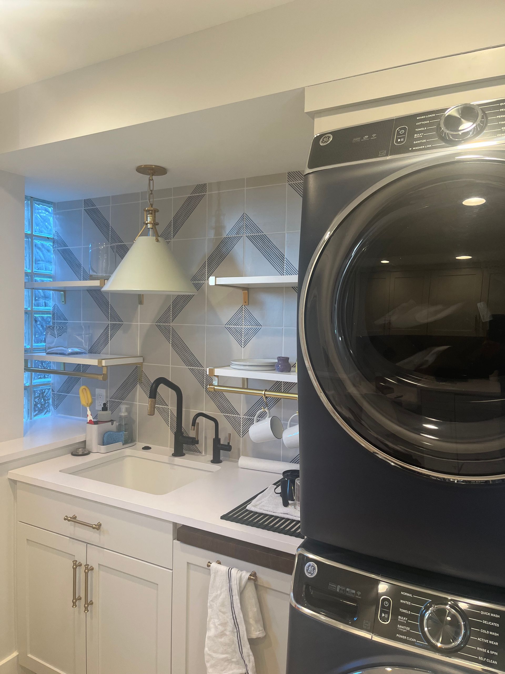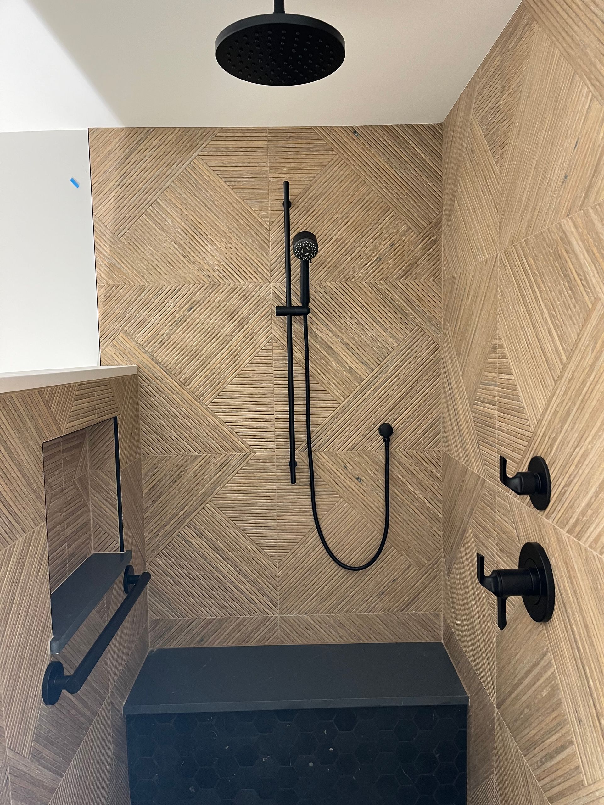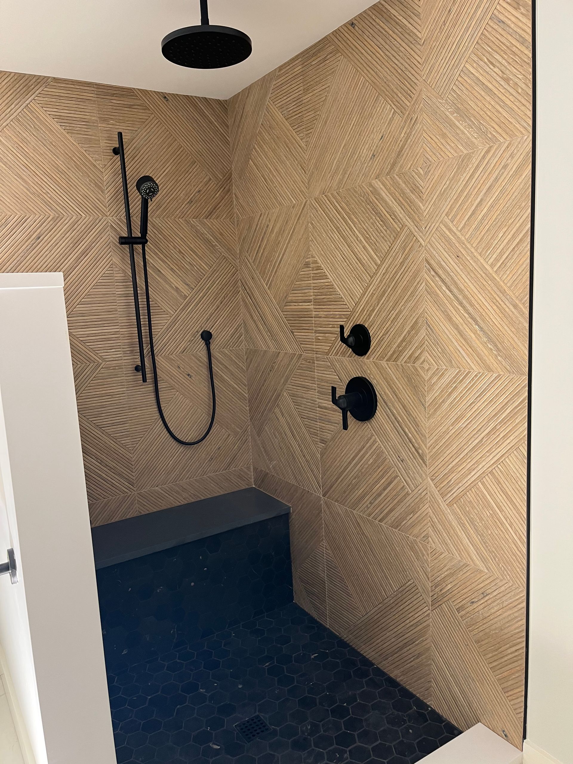 - Tile work on new walk-in shower with pony wall, bench and built-in niche, and new tile work on laundry/craft room backsplash.