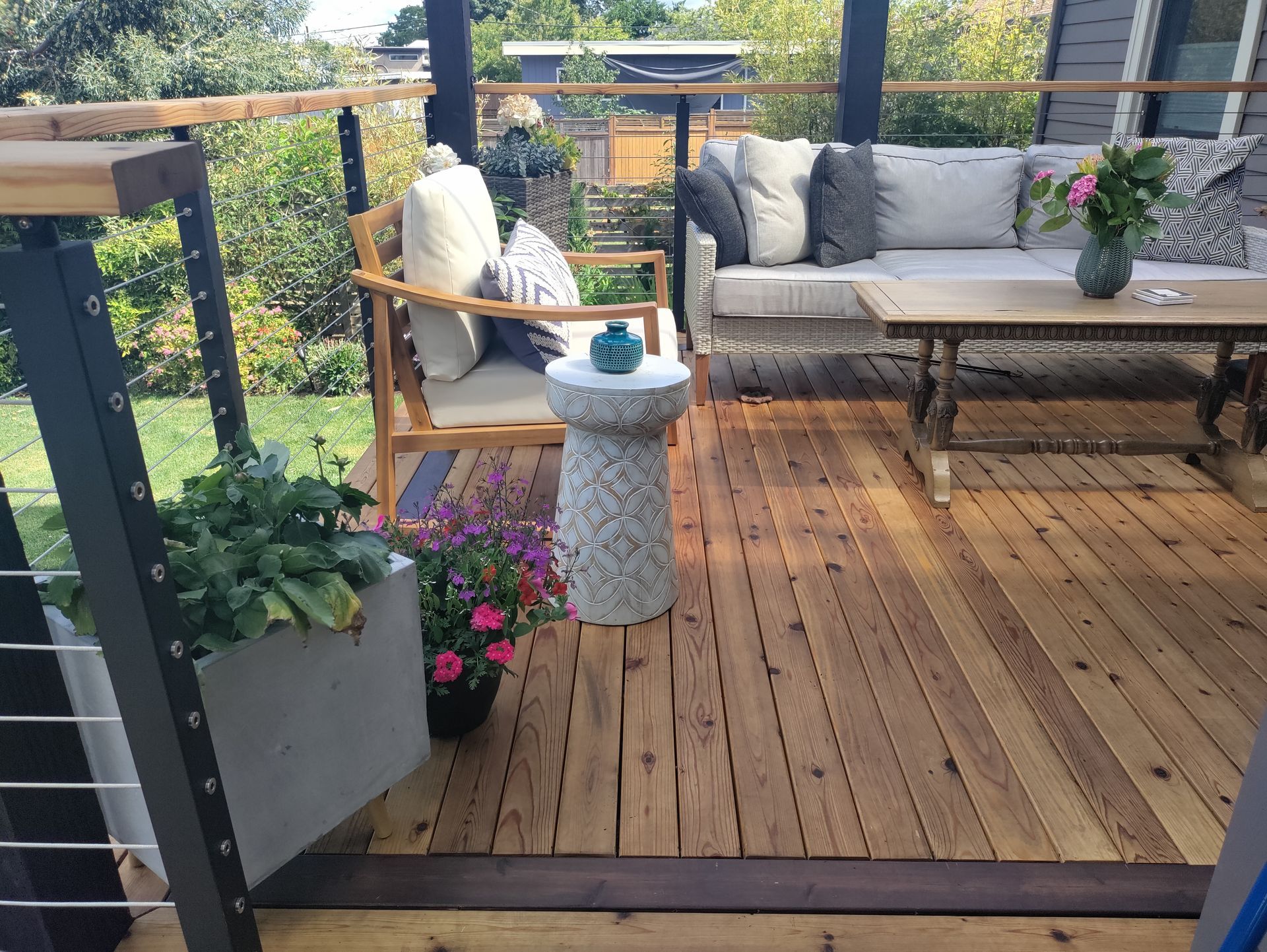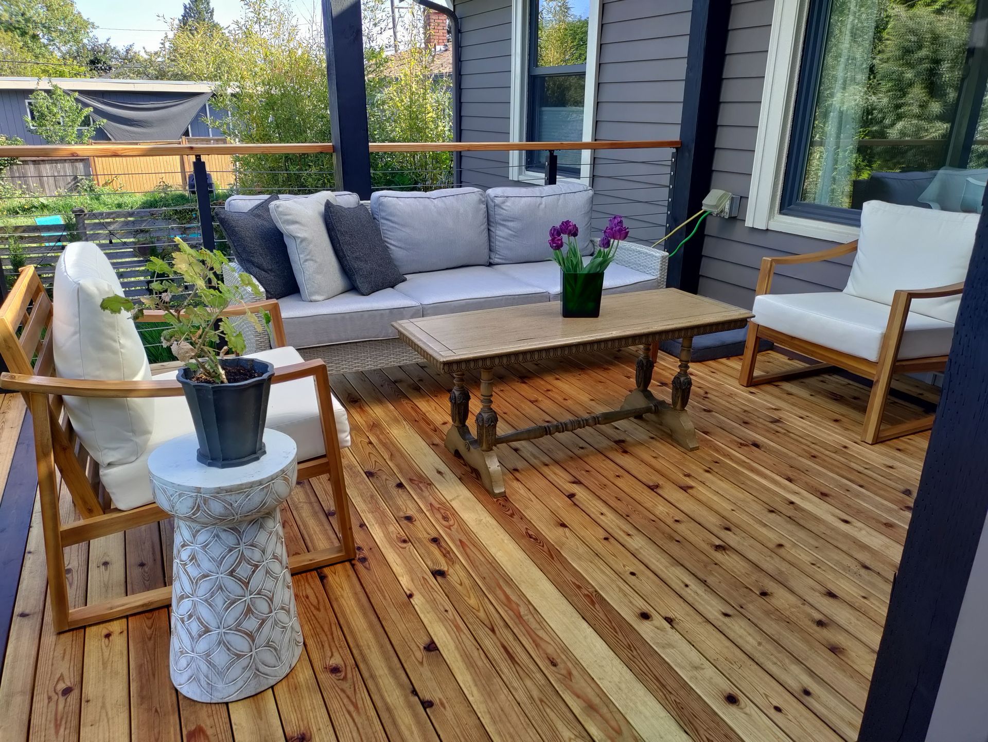 - We installed wood cedar on the deck floor, threads and risers as well as on handrails and fascia boards.