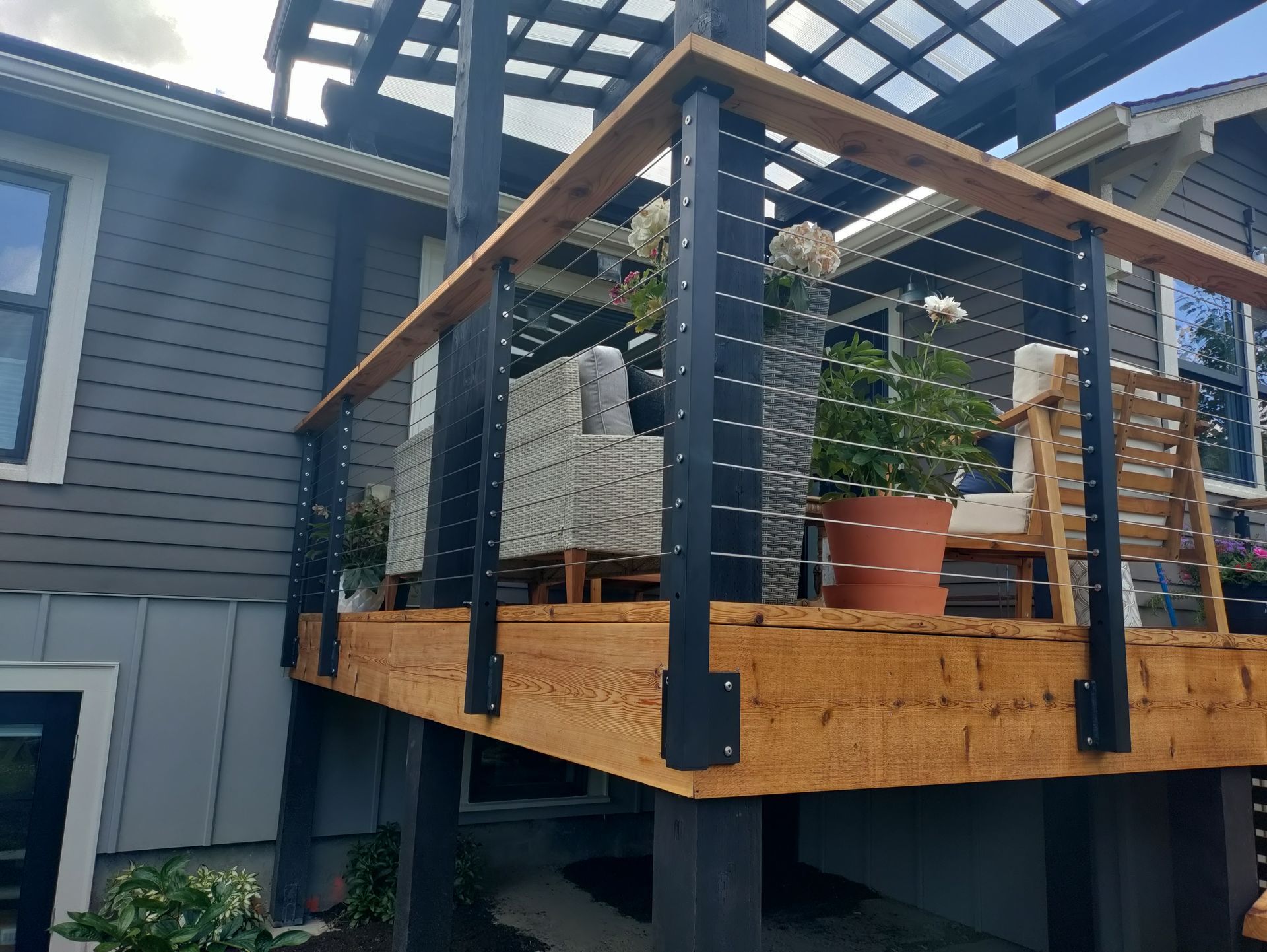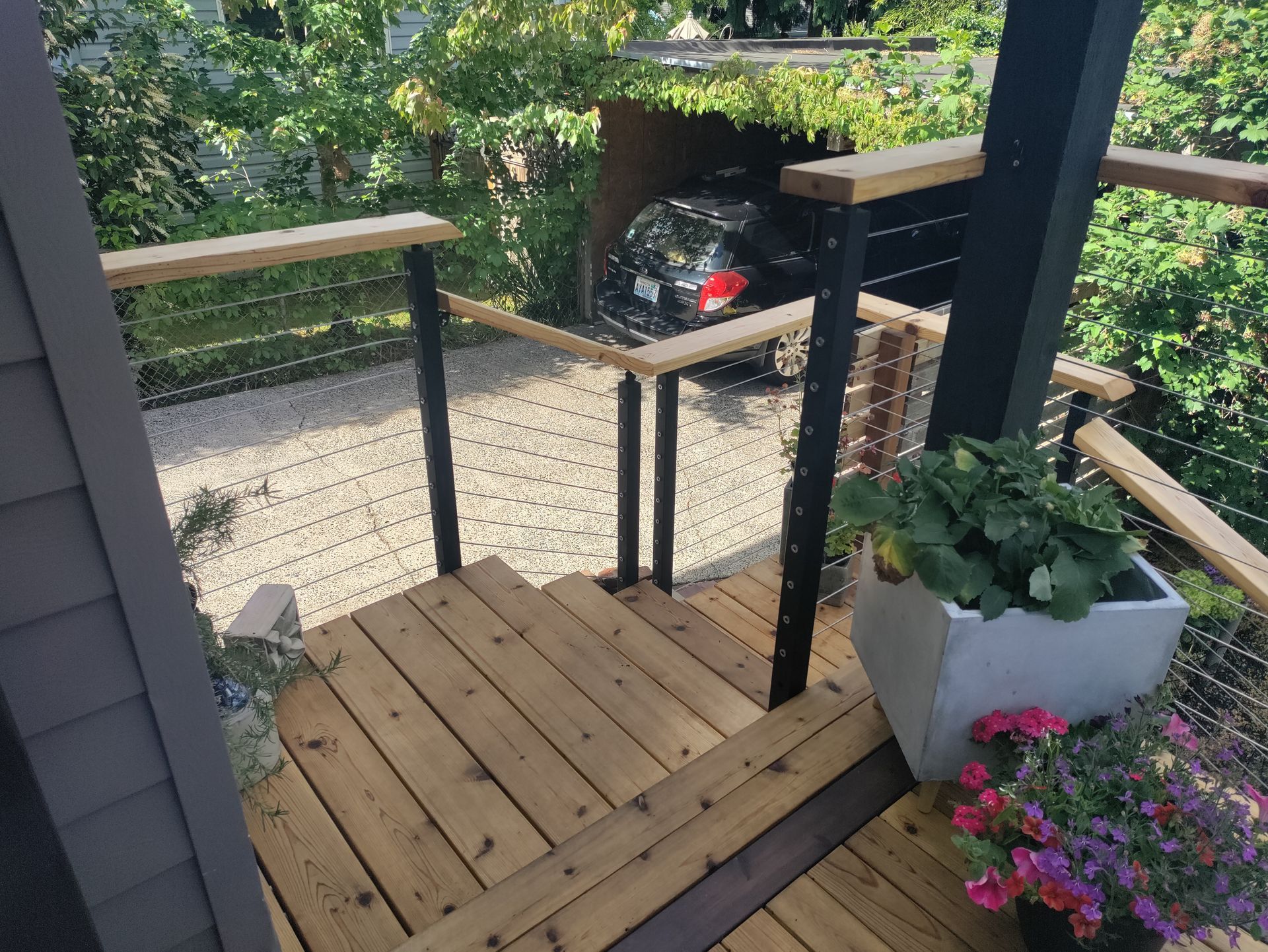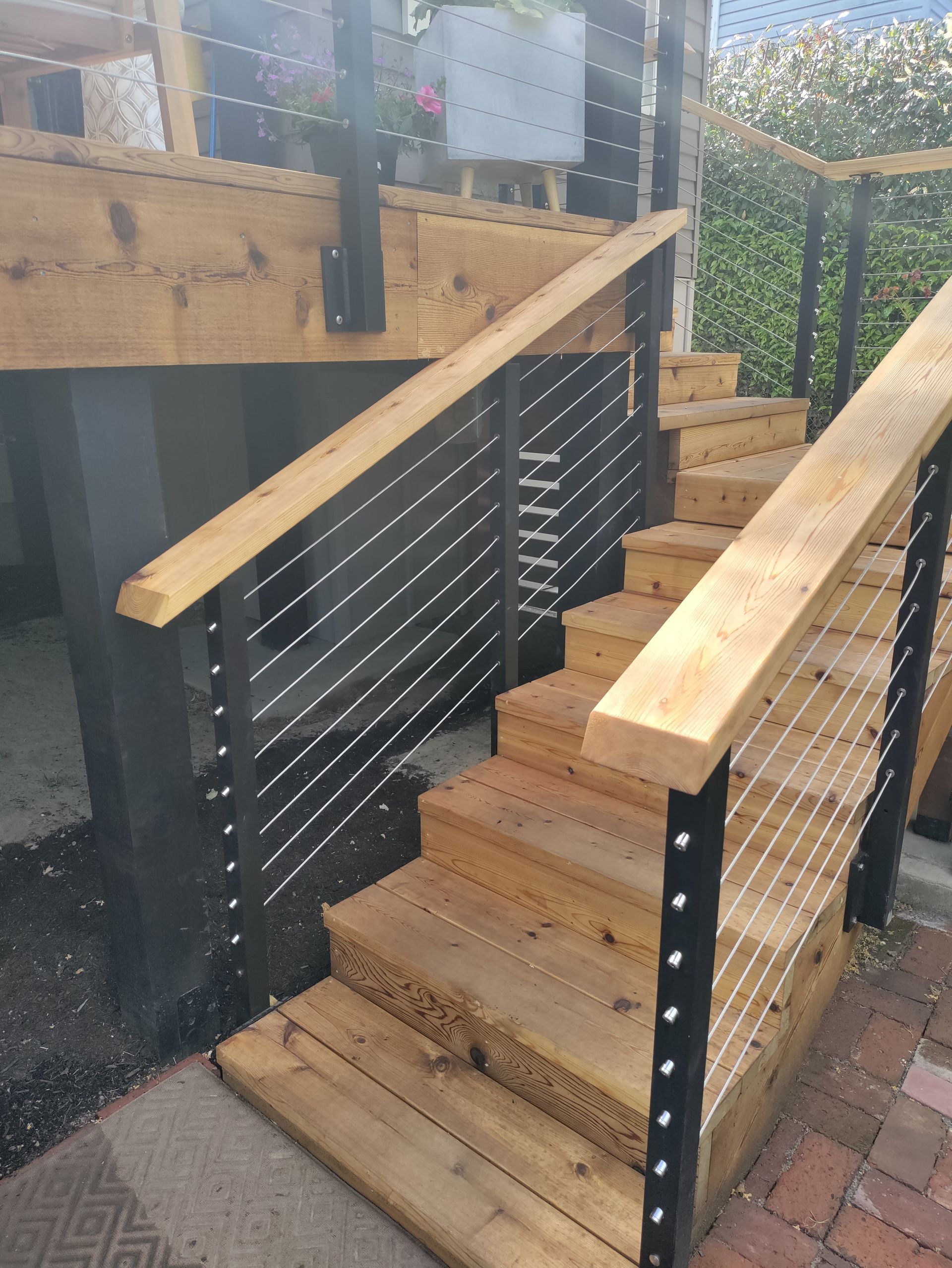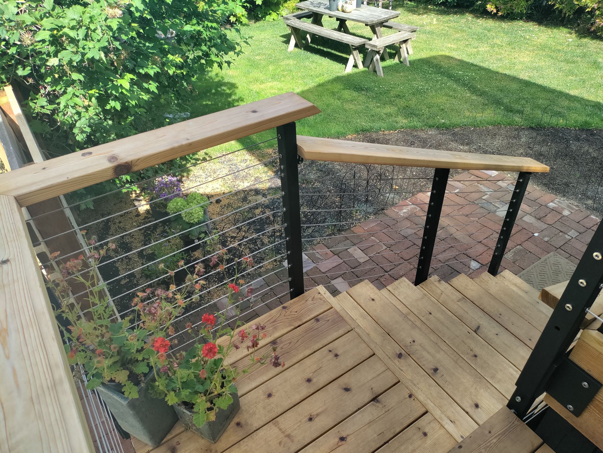 - We installed black metal railing with wiring around the perimeter of the deck and stairs.