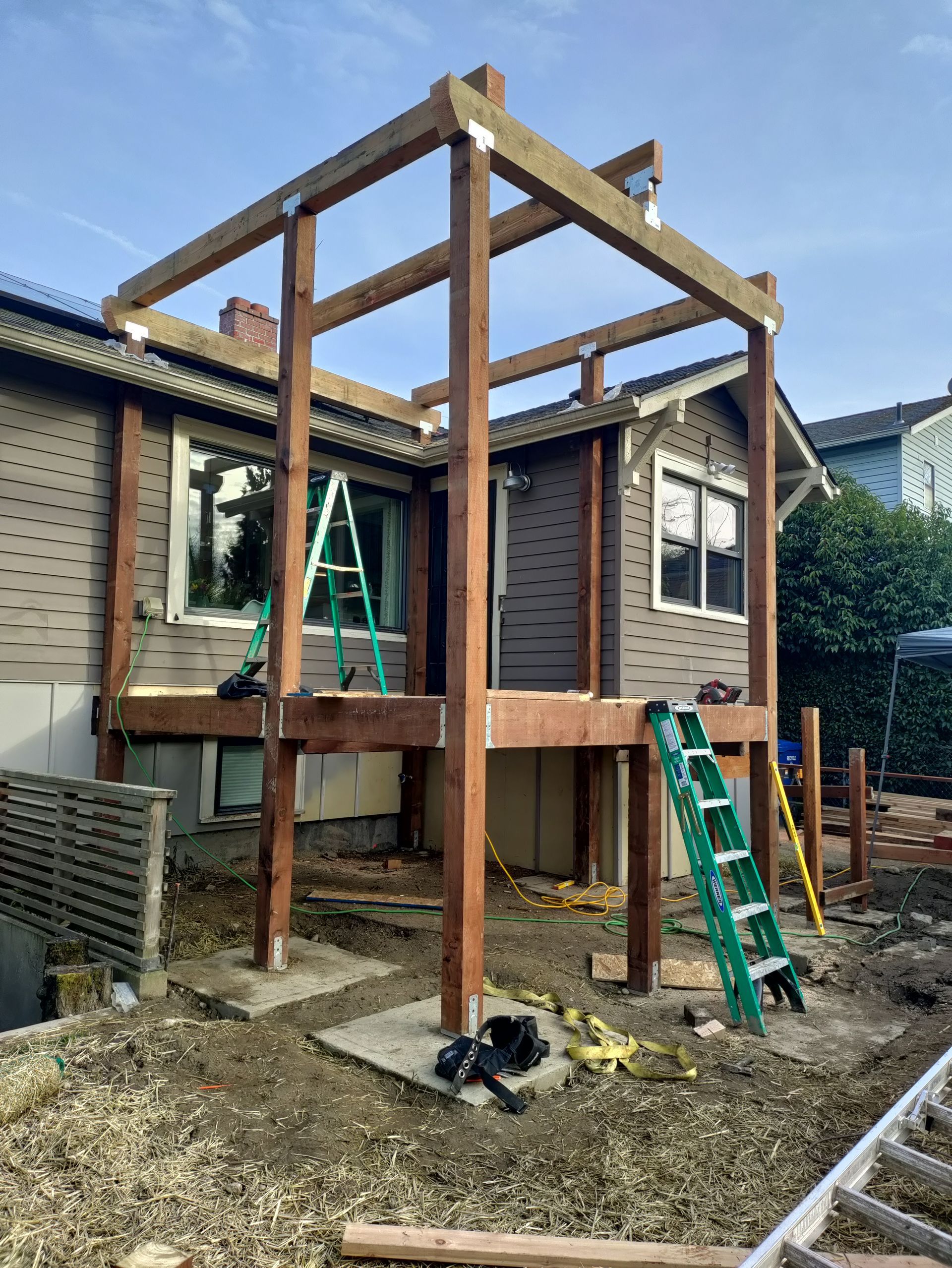 - Installed structural posts and beams, and ceiling joist structure for the new roof.