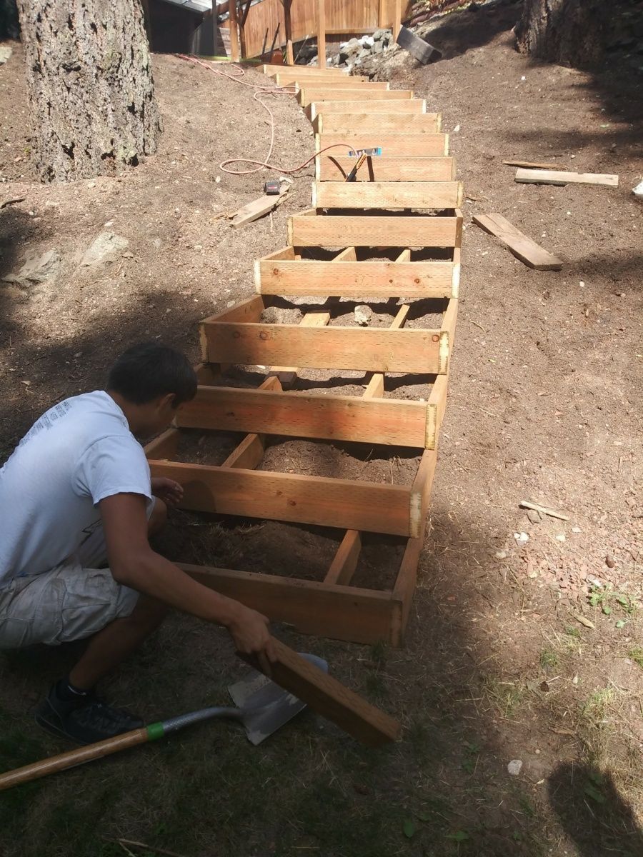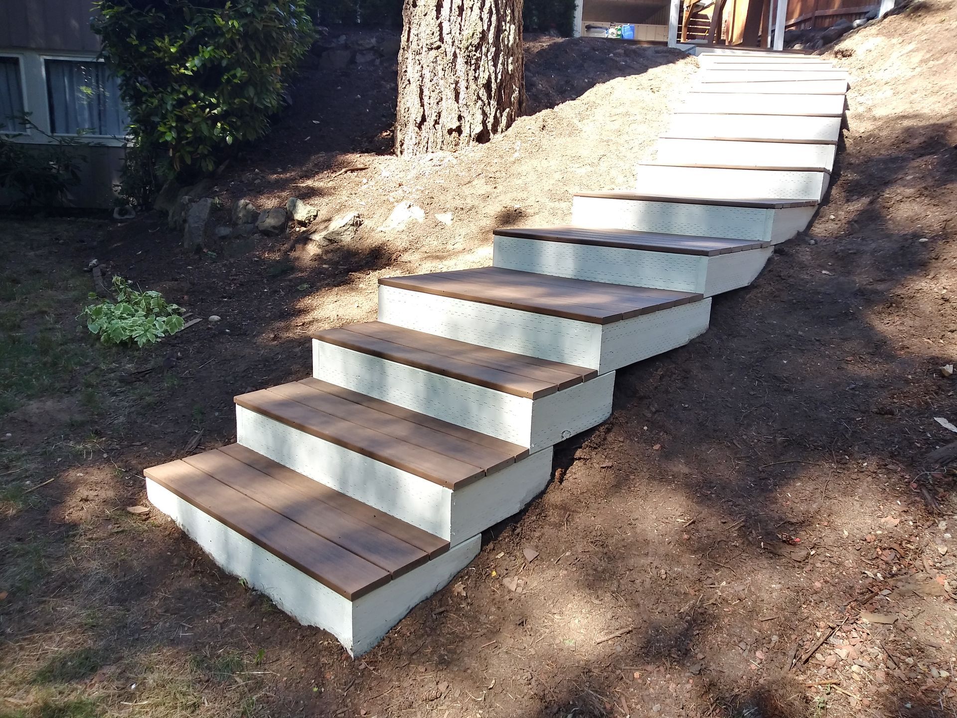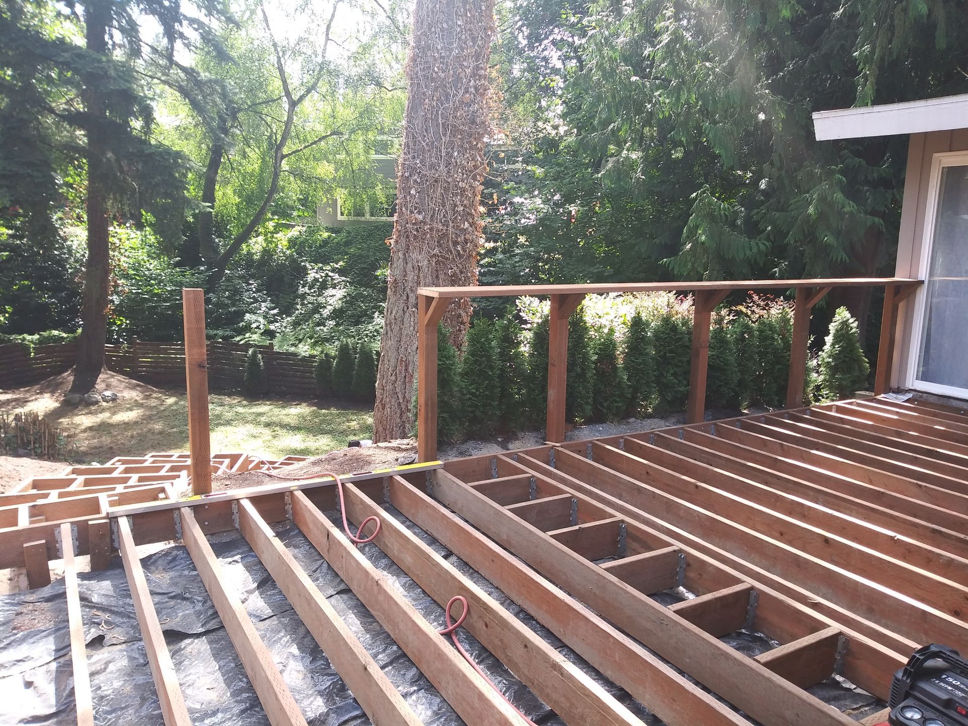 - Installed new treated joists for exterior decking structure and framed a long set of steps from the upper deck area to the lower back lawn area, for a safer and less steep slope.