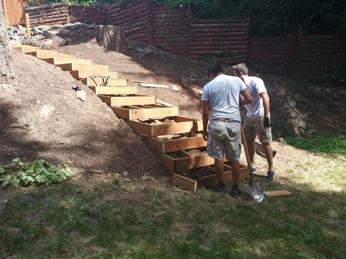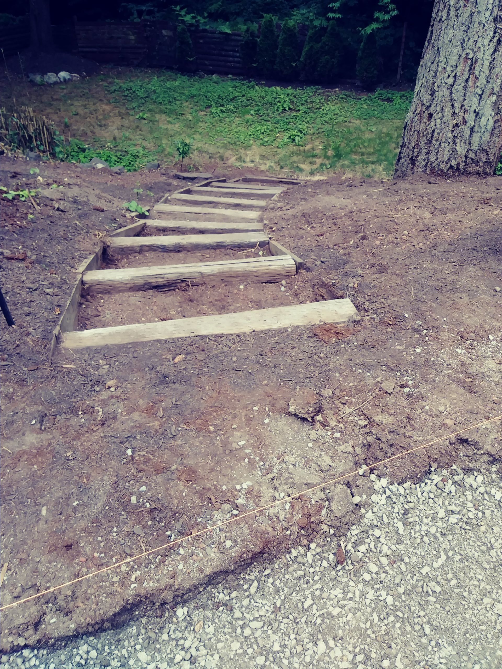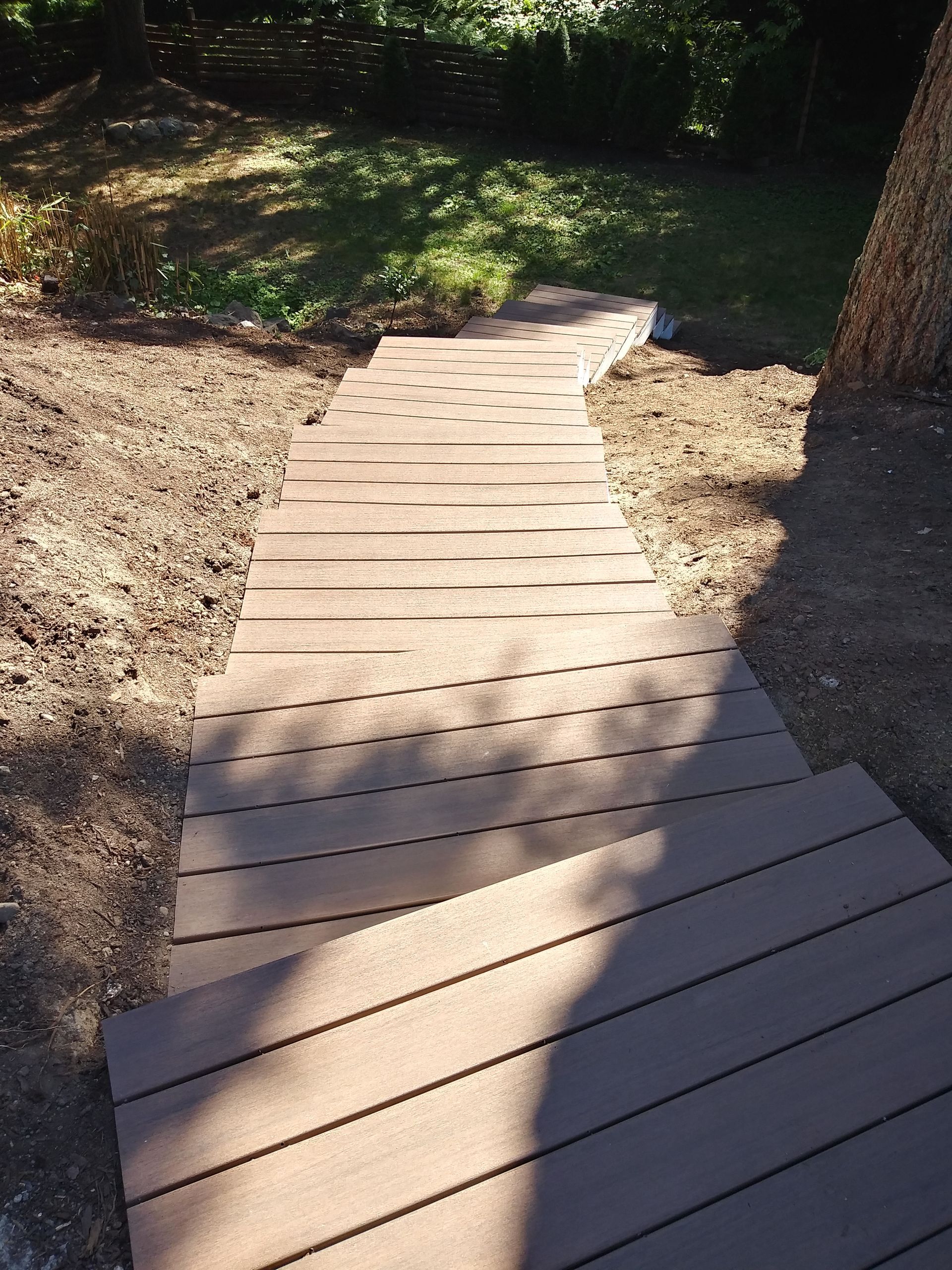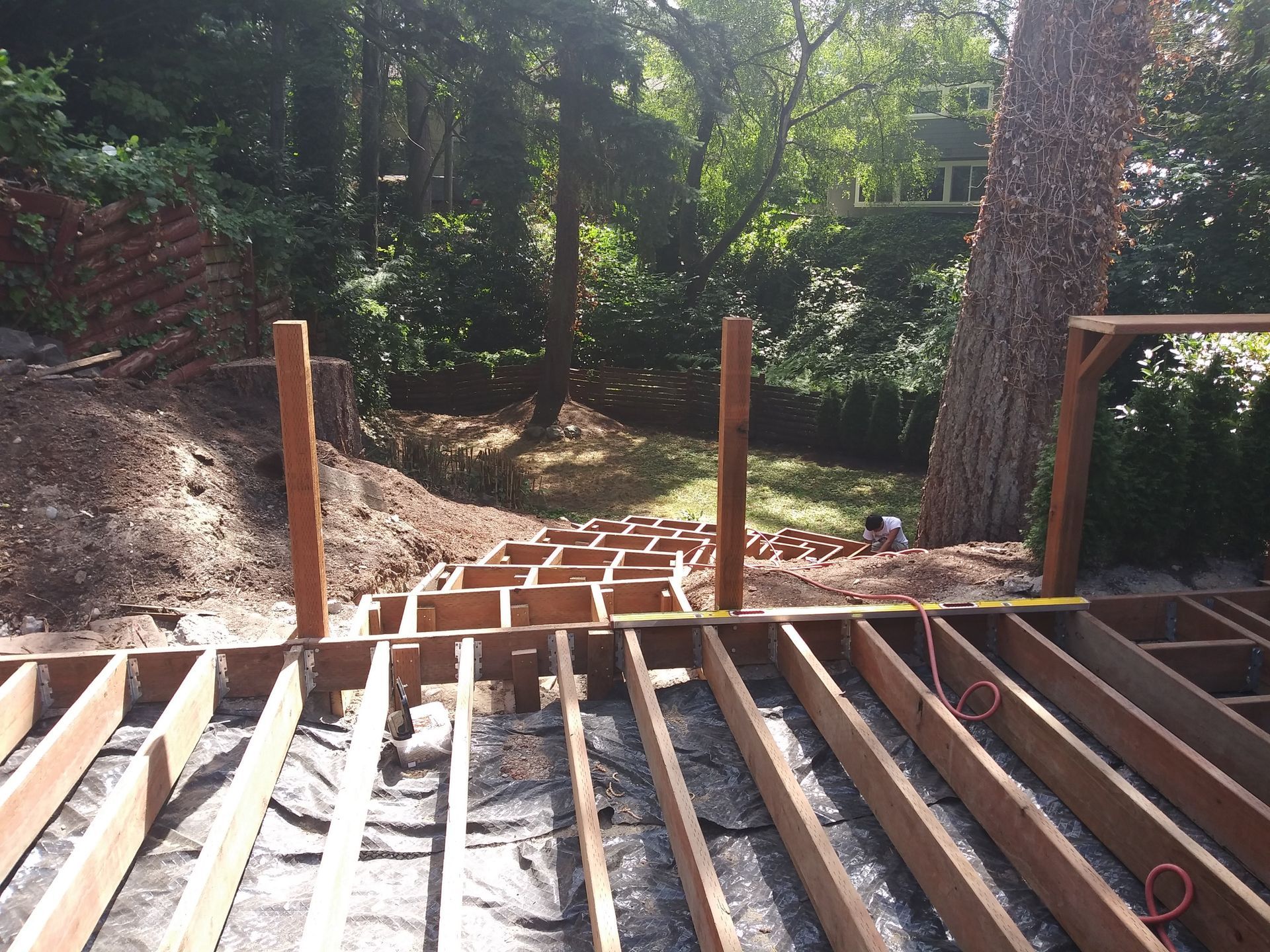 - Removed all existing pavers, vegetation and unsafe wood makeshift steps. Installed all groundworks and drainage for the new deck.