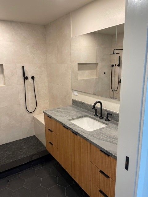 - Remodeled two bathrooms, including new tile work etc., all new wall hardware, quartz counters, lighting, and plumbing fixtures.