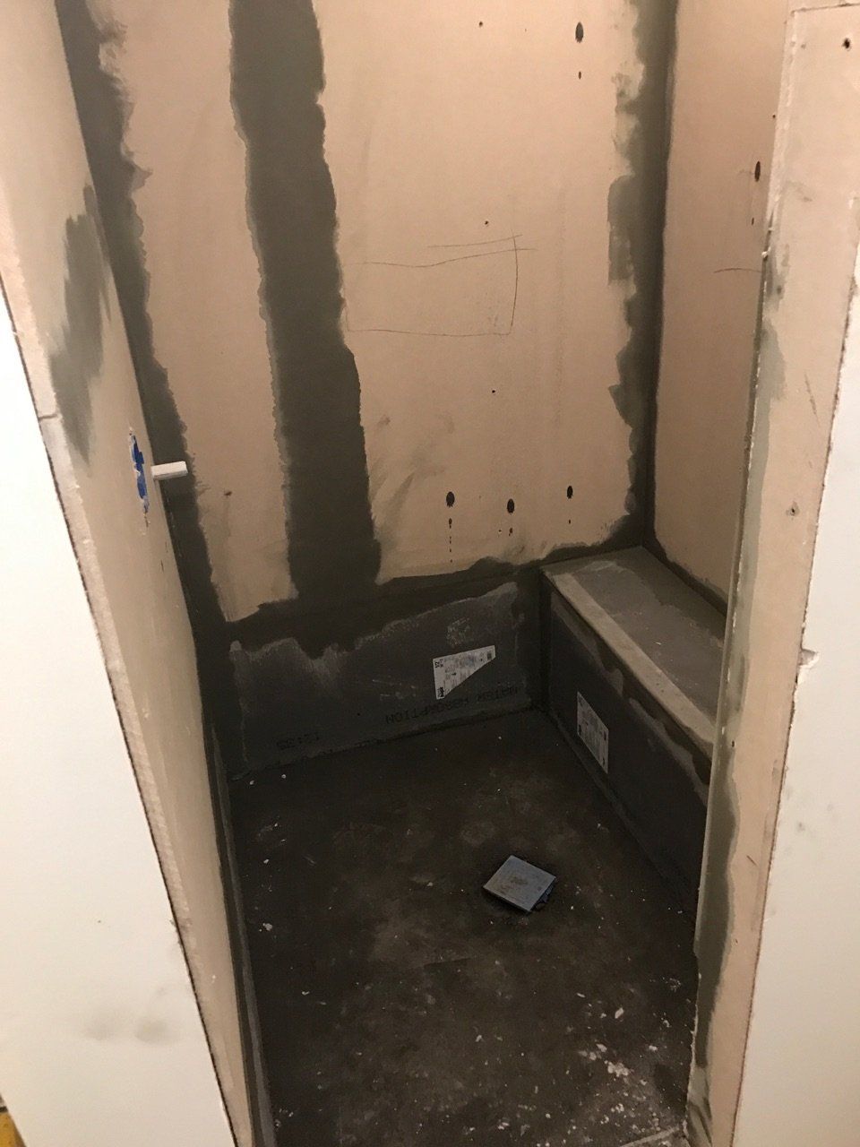 - New walk in shower and curb with 3”X6’ white subway tiles on walls, curb and bench, with stone slab cap on bench.
