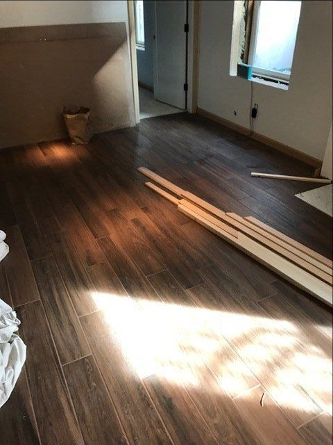 - Install new 6”x36” walnut color wood plank porcelain tiles (to mimic hardwood aesthetic, but more durable and water resistant for a basement floor) over the entire basement floor (excluding bedroom and bathroom floors).