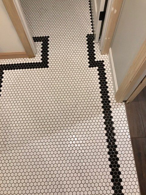 - New 1”X1” white hex tiles on bathroom floor and shower pan, with 1”x1” black hex tile perimeter deco stripe.