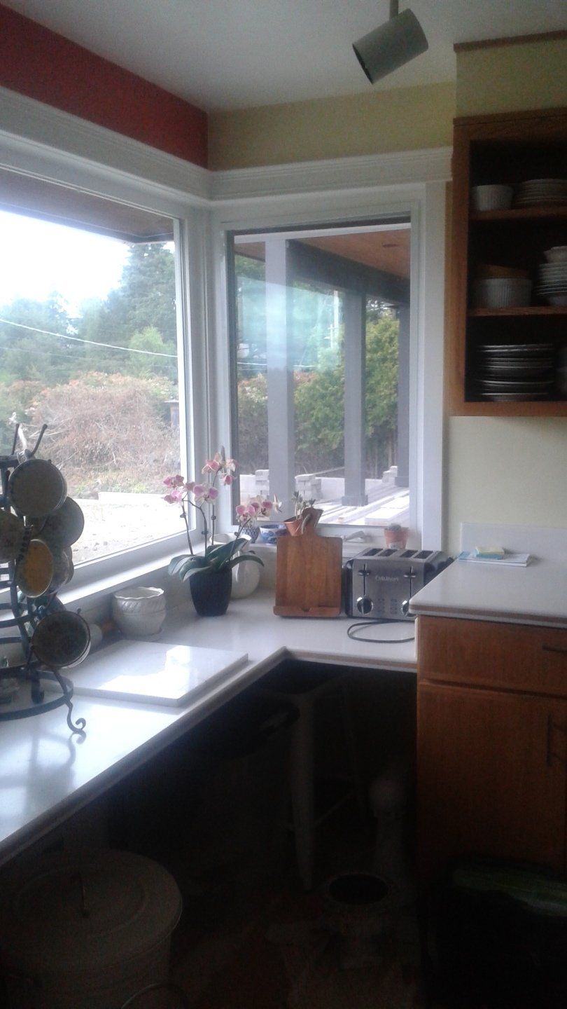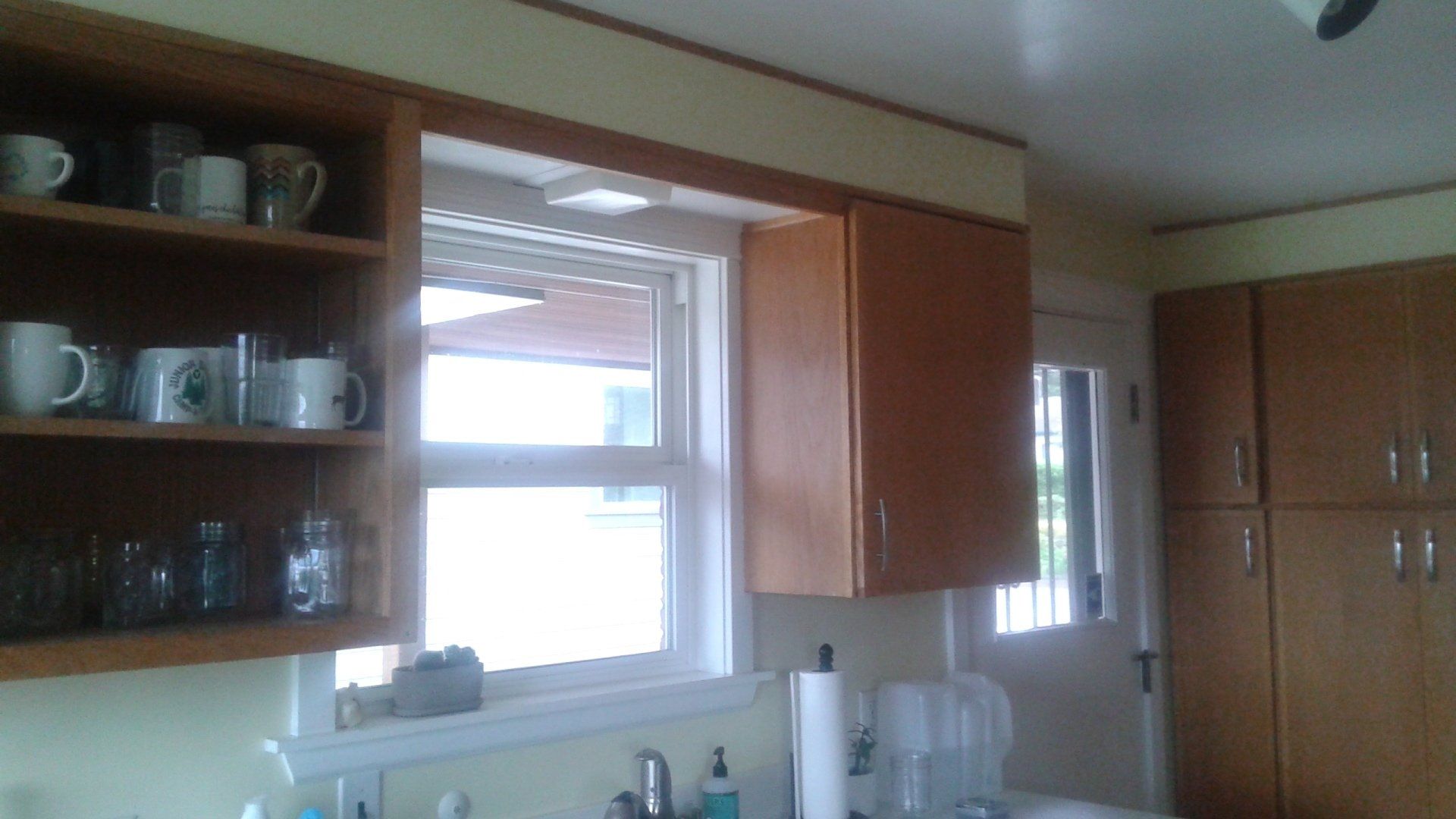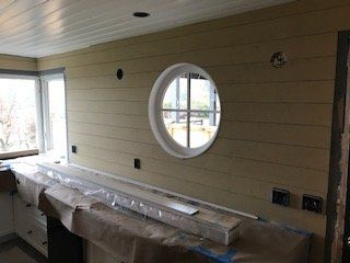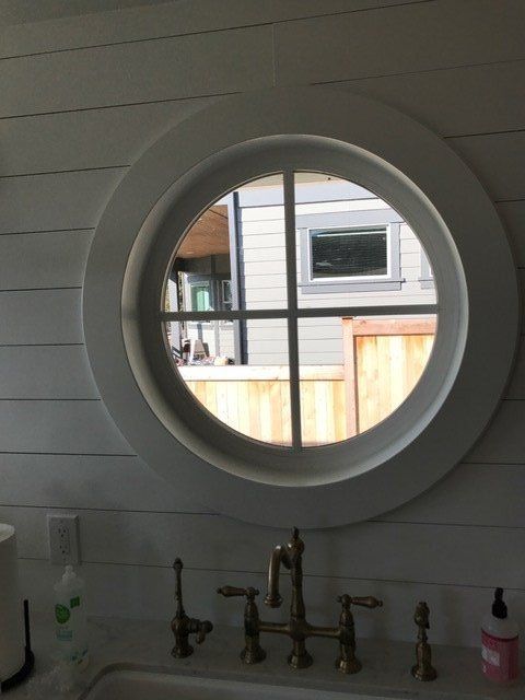 - New circular sink window, installed with custom made wood trim detail, and painted.
