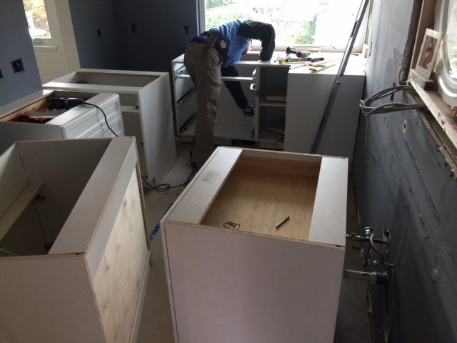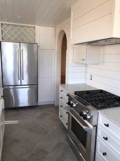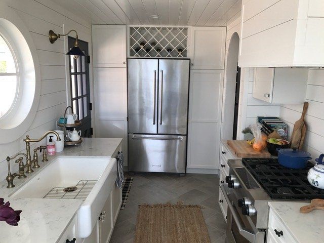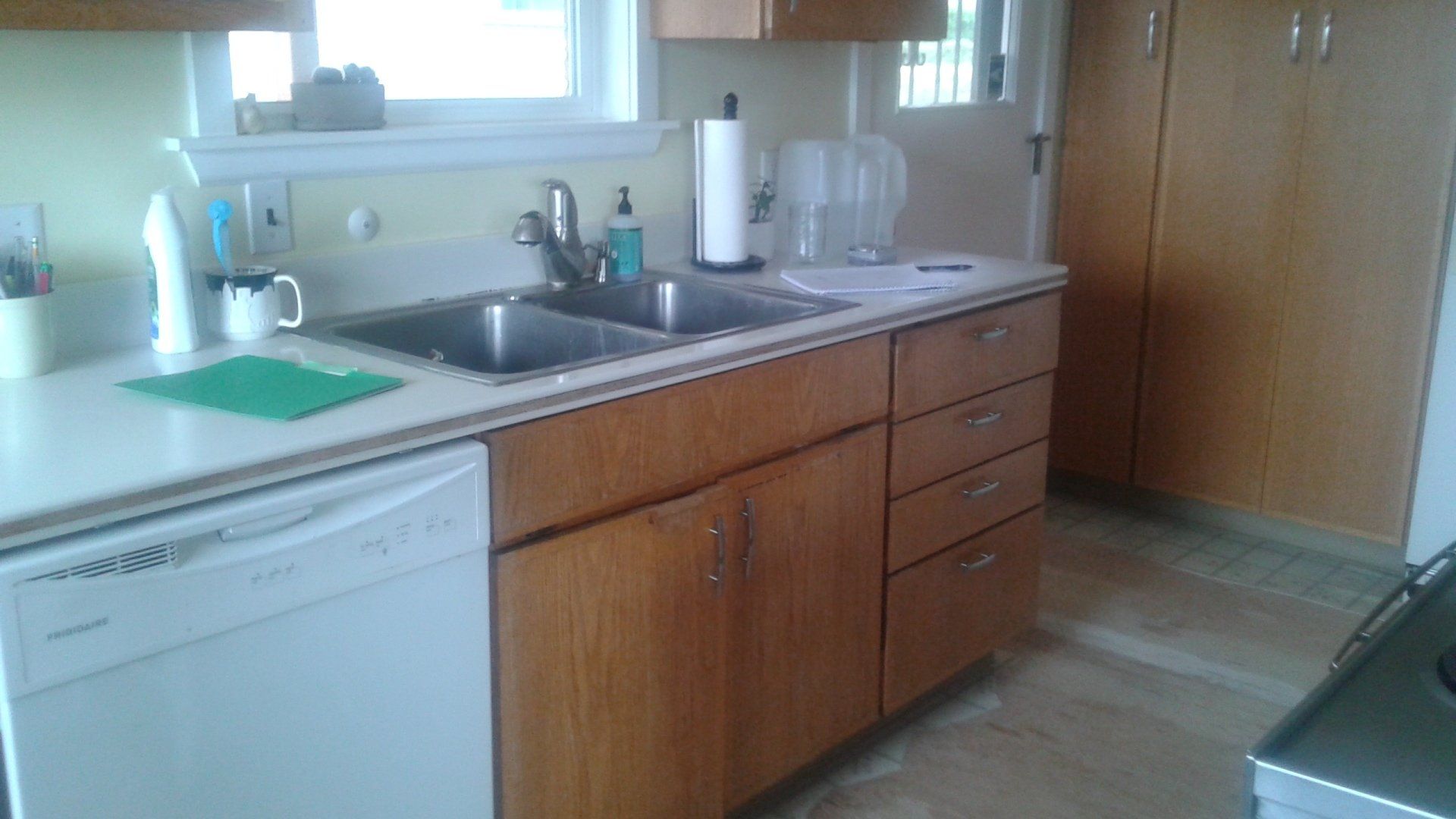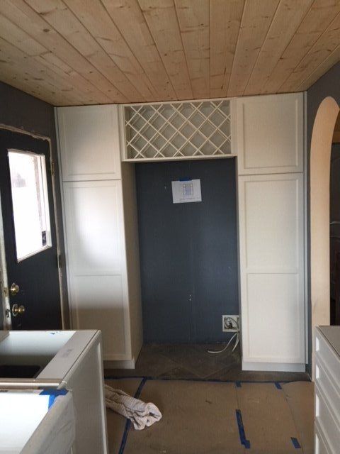 - All new custom made cabinets, and custom built hooded box area for the stove, wine rack above fridge.