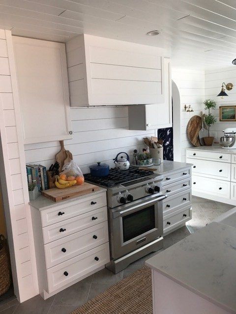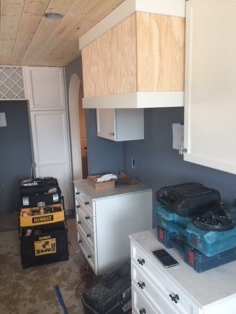 - All new custom made cabinets, and custom built hooded box area for the stove, wine rack above fridge.
