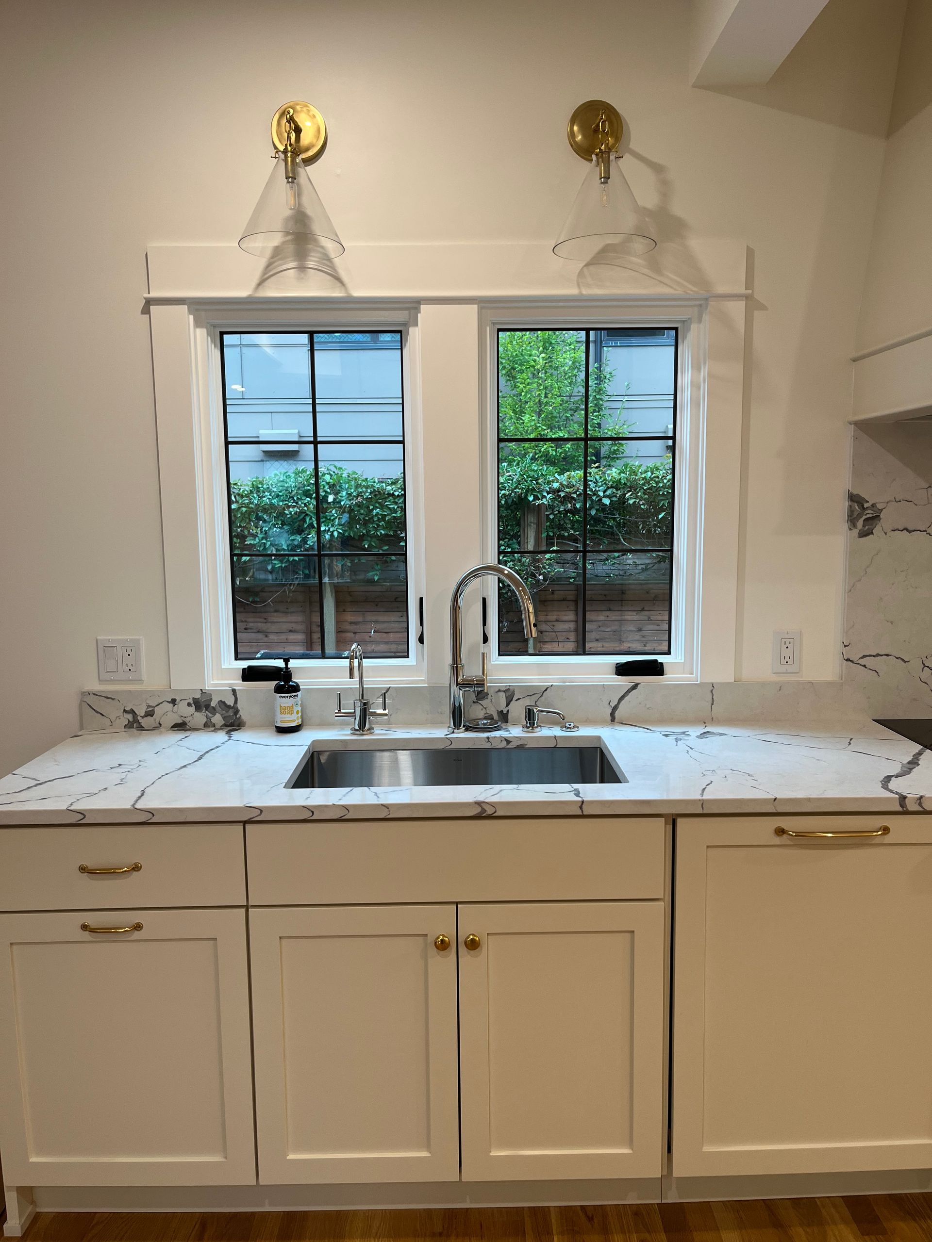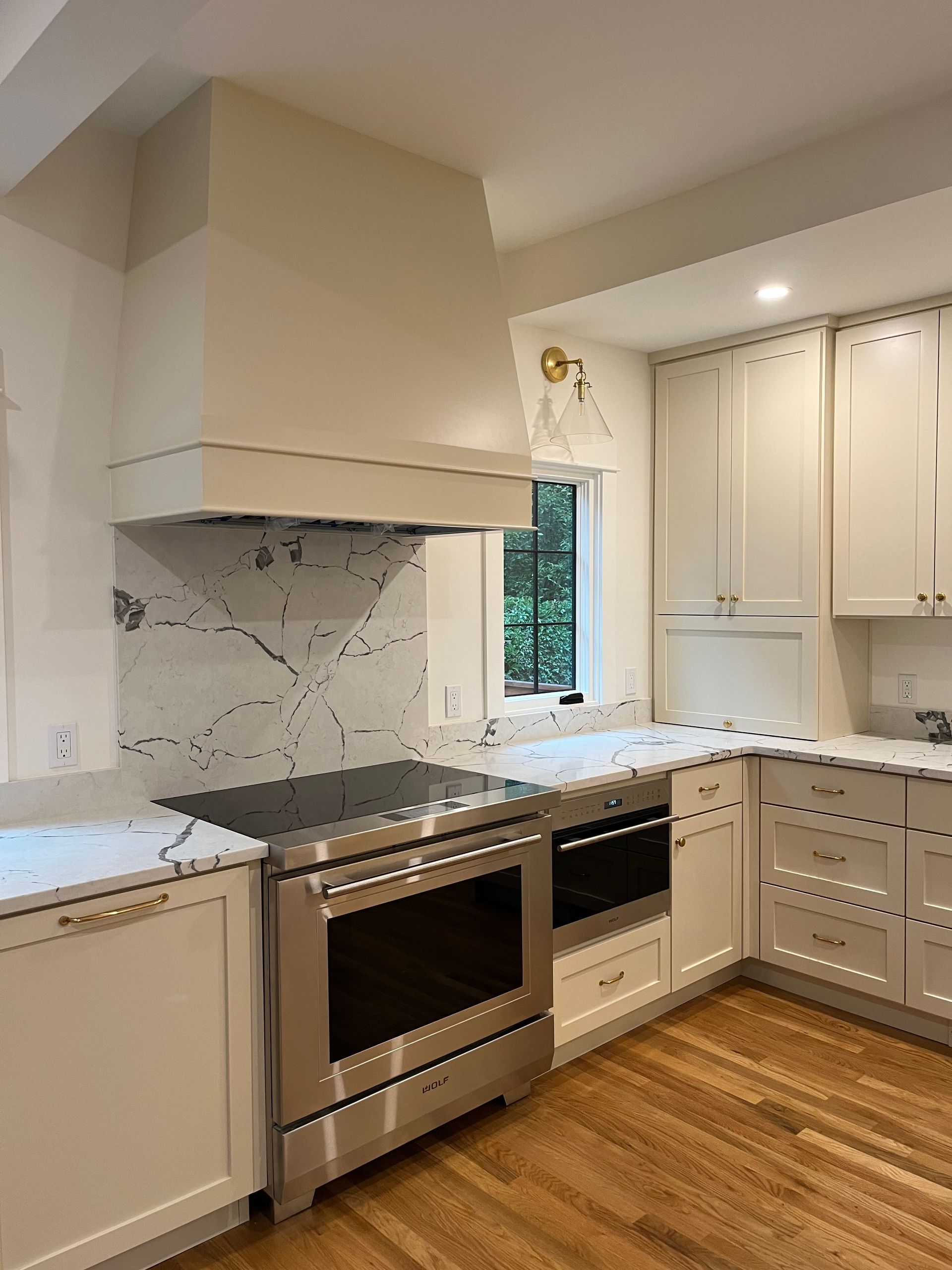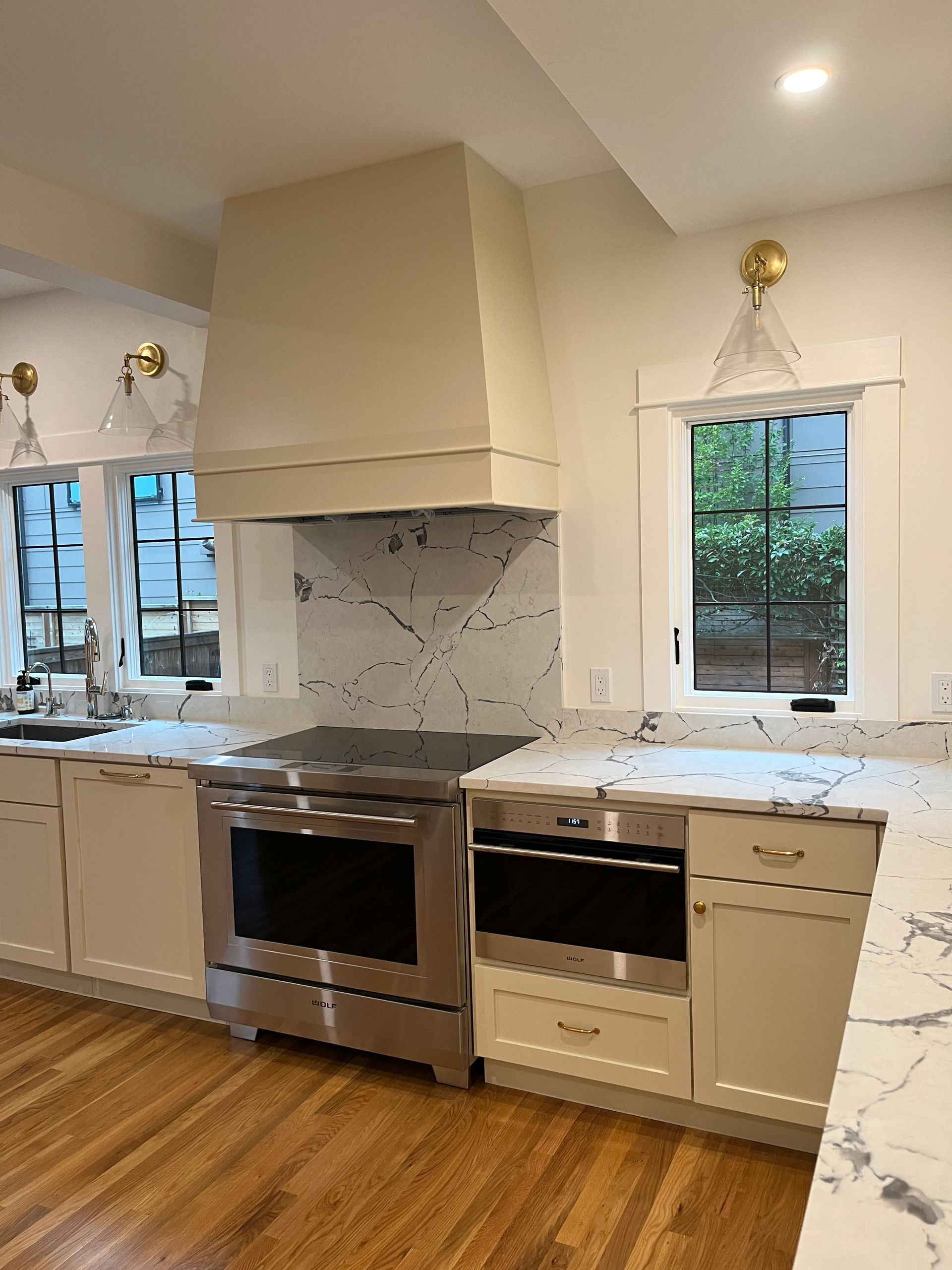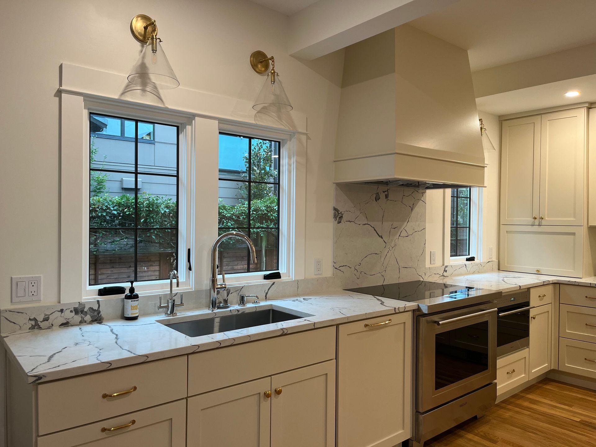 - Quartz slab on counters, backsplash and on the area below the stove hood vent.