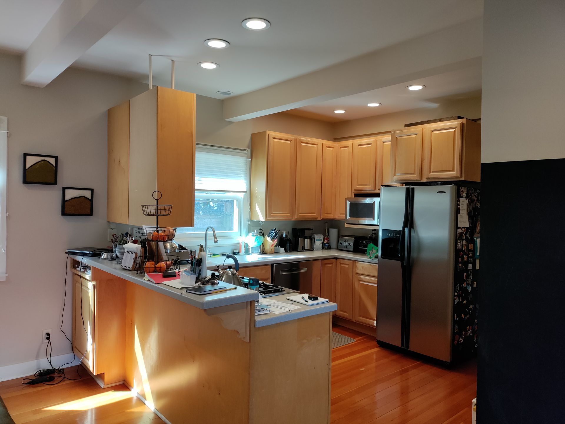 - We removed side wall of kitchen to the existing hallway to the back deck, to enlarge the footprint of the kitchen.